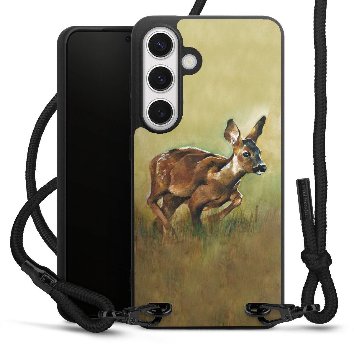 The matt black silicone case is made of flexible TPU (thermoplastic polyurethane) and offers robust protection. The durable, unbreakable material makes the cover flexible and dimensionally stable at the same time. The matte surface makes your design stand out more and is less susceptible to fingerprints and dirt. The stylish trend accessory fits comfortably in the hand and is perfectly complemented by the fabric (polyester) mobile phone strap. The braided fabric strap is approx. 1.70 metres long with a diameter of approx. 0.5 cm. Due to the special knotting technique, the length of the strap can be adjusted by simply pulling it, so that you can adapt it individually to your wishes. The practical case to wear around your neck is available with the fabric strap in black. As a little icing on the cake, we have provided the strap with a chic metal fastener in matt black. The strap is securely fastened to the case with loops made of high-quality genuine leather and press studs. The ends of the fabric strap are covered with metallic end caps and thus protected from fraying.