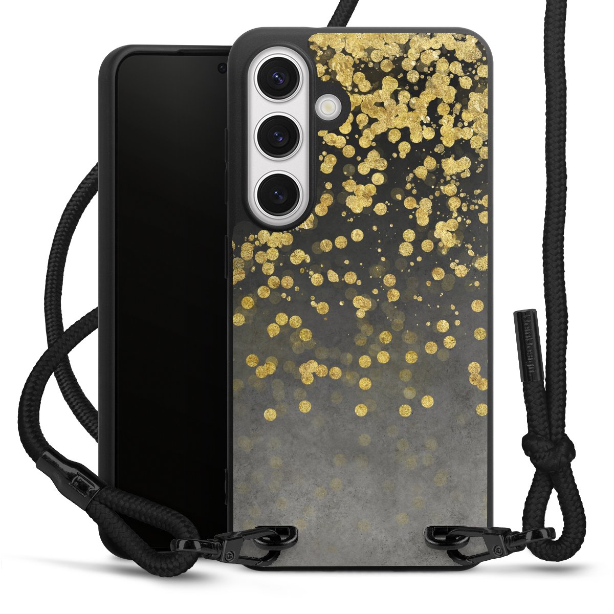 The matt black silicone case is made of flexible TPU (thermoplastic polyurethane) and offers robust protection. The durable, unbreakable material makes the cover flexible and dimensionally stable at the same time. The matte surface makes your design stand out more and is less susceptible to fingerprints and dirt. The stylish trend accessory fits comfortably in the hand and is perfectly complemented by the fabric (polyester) mobile phone strap. The braided fabric strap is approx. 1.70 metres long with a diameter of approx. 0.5 cm. Due to the special knotting technique, the length of the strap can be adjusted by simply pulling it, so that you can adapt it individually to your wishes. The practical case to wear around your neck is available with the fabric strap in black. As a little icing on the cake, we have provided the strap with a chic metal fastener in matt black. The strap is securely fastened to the case with loops made of high-quality genuine leather and press studs. The ends of the fabric strap are covered with metallic end caps and thus protected from fraying.
