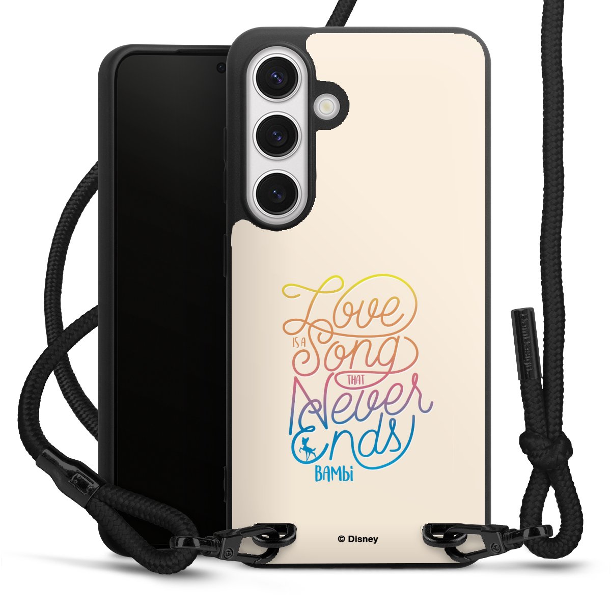 The matt black silicone case is made of flexible TPU (thermoplastic polyurethane) and offers robust protection. The durable, unbreakable material makes the cover flexible and dimensionally stable at the same time. The matte surface makes your design stand out more and is less susceptible to fingerprints and dirt. The stylish trend accessory fits comfortably in the hand and is perfectly complemented by the fabric (polyester) mobile phone strap. The braided fabric strap is approx. 1.70 metres long with a diameter of approx. 0.5 cm. Due to the special knotting technique, the length of the strap can be adjusted by simply pulling it, so that you can adapt it individually to your wishes. The practical case to wear around your neck is available with the fabric strap in black. As a little icing on the cake, we have provided the strap with a chic metal fastener in matt black. The strap is securely fastened to the case with loops made of high-quality genuine leather and press studs. The ends of the fabric strap are covered with metallic end caps and thus protected from fraying.