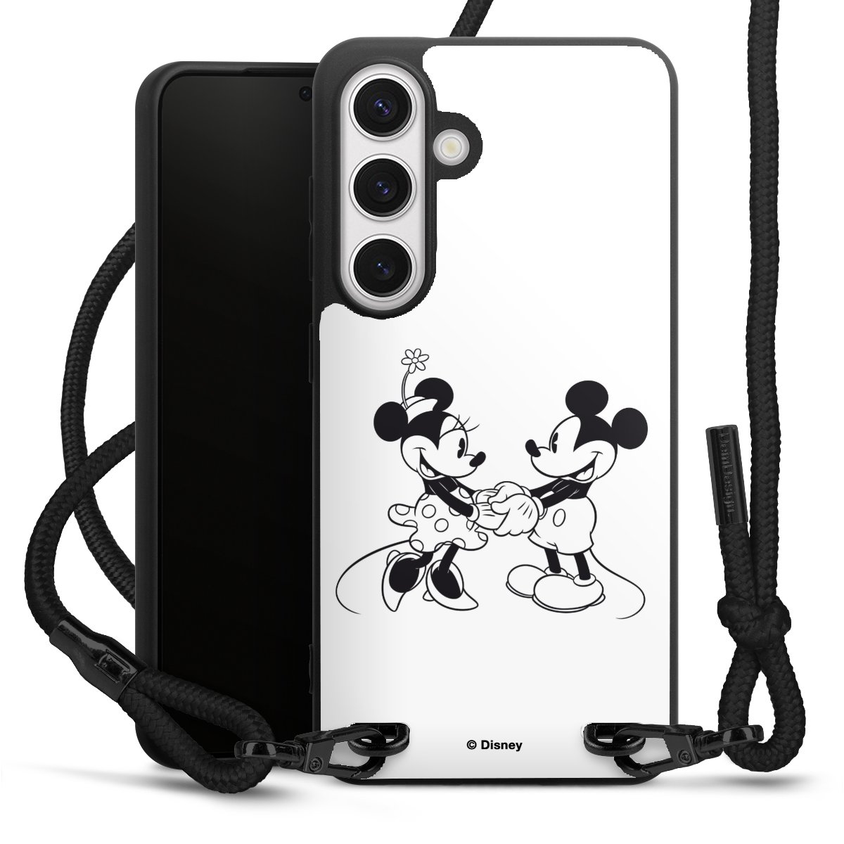 The matt black silicone case is made of flexible TPU (thermoplastic polyurethane) and offers robust protection. The durable, unbreakable material makes the cover flexible and dimensionally stable at the same time. The matte surface makes your design stand out more and is less susceptible to fingerprints and dirt. The stylish trend accessory fits comfortably in the hand and is perfectly complemented by the fabric (polyester) mobile phone strap. The braided fabric strap is approx. 1.70 metres long with a diameter of approx. 0.5 cm. Due to the special knotting technique, the length of the strap can be adjusted by simply pulling it, so that you can adapt it individually to your wishes. The practical case to wear around your neck is available with the fabric strap in black. As a little icing on the cake, we have provided the strap with a chic metal fastener in matt black. The strap is securely fastened to the case with loops made of high-quality genuine leather and press studs. The ends of the fabric strap are covered with metallic end caps and thus protected from fraying.