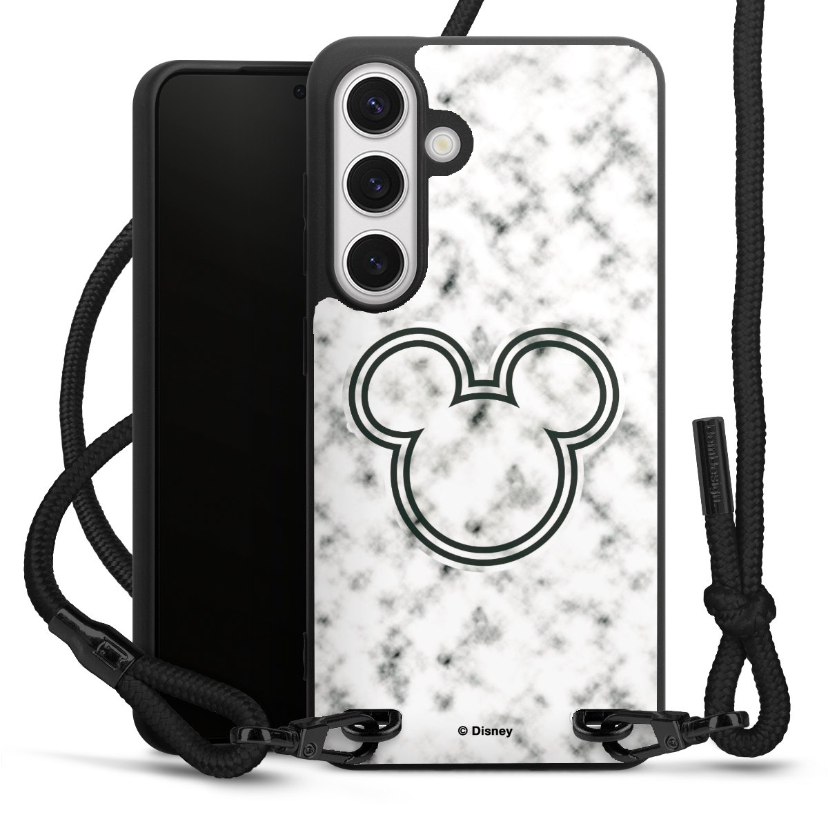 The matt black silicone case is made of flexible TPU (thermoplastic polyurethane) and offers robust protection. The durable, unbreakable material makes the cover flexible and dimensionally stable at the same time. The matte surface makes your design stand out more and is less susceptible to fingerprints and dirt. The stylish trend accessory fits comfortably in the hand and is perfectly complemented by the fabric (polyester) mobile phone strap. The braided fabric strap is approx. 1.70 metres long with a diameter of approx. 0.5 cm. Due to the special knotting technique, the length of the strap can be adjusted by simply pulling it, so that you can adapt it individually to your wishes. The practical case to wear around your neck is available with the fabric strap in black. As a little icing on the cake, we have provided the strap with a chic metal fastener in matt black. The strap is securely fastened to the case with loops made of high-quality genuine leather and press studs. The ends of the fabric strap are covered with metallic end caps and thus protected from fraying.