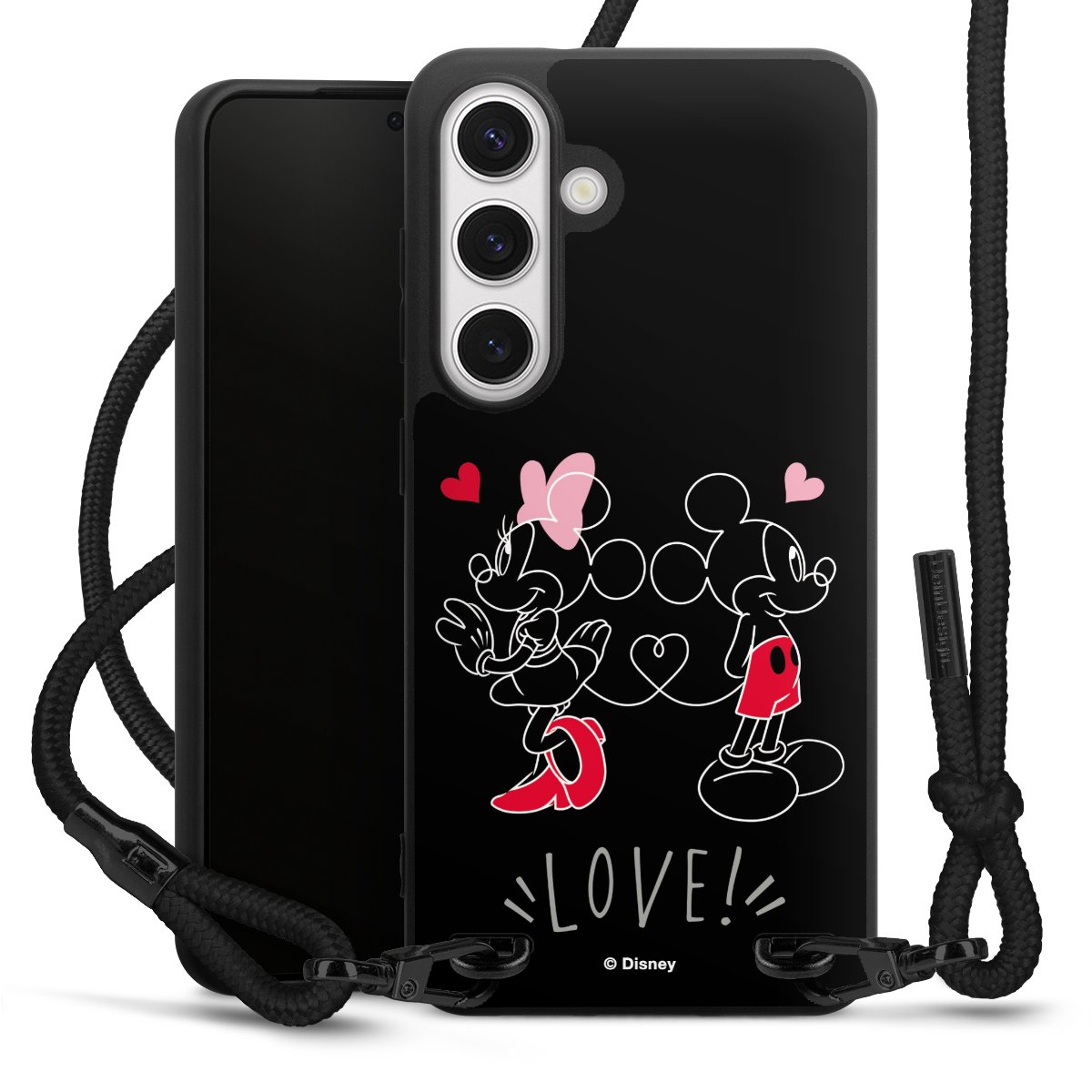 The matt black silicone case is made of flexible TPU (thermoplastic polyurethane) and offers robust protection. The durable, unbreakable material makes the cover flexible and dimensionally stable at the same time. The matte surface makes your design stand out more and is less susceptible to fingerprints and dirt. The stylish trend accessory fits comfortably in the hand and is perfectly complemented by the fabric (polyester) mobile phone strap. The braided fabric strap is approx. 1.70 metres long with a diameter of approx. 0.5 cm. Due to the special knotting technique, the length of the strap can be adjusted by simply pulling it, so that you can adapt it individually to your wishes. The practical case to wear around your neck is available with the fabric strap in black. As a little icing on the cake, we have provided the strap with a chic metal fastener in matt black. The strap is securely fastened to the case with loops made of high-quality genuine leather and press studs. The ends of the fabric strap are covered with metallic end caps and thus protected from fraying.
