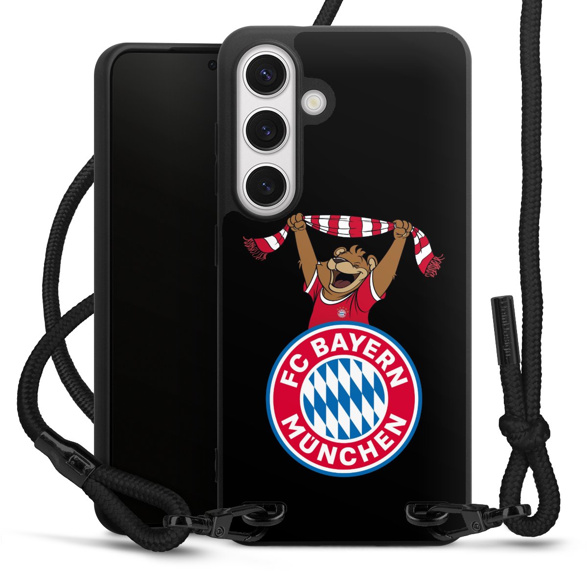 The matt black silicone case is made of flexible TPU (thermoplastic polyurethane) and offers robust protection. The durable, unbreakable material makes the cover flexible and dimensionally stable at the same time. The matte surface makes your design stand out more and is less susceptible to fingerprints and dirt. The stylish trend accessory fits comfortably in the hand and is perfectly complemented by the fabric (polyester) mobile phone strap. The braided fabric strap is approx. 1.70 metres long with a diameter of approx. 0.5 cm. Due to the special knotting technique, the length of the strap can be adjusted by simply pulling it, so that you can adapt it individually to your wishes. The practical case to wear around your neck is available with the fabric strap in black. As a little icing on the cake, we have provided the strap with a chic metal fastener in matt black. The strap is securely fastened to the case with loops made of high-quality genuine leather and press studs. The ends of the fabric strap are covered with metallic end caps and thus protected from fraying.