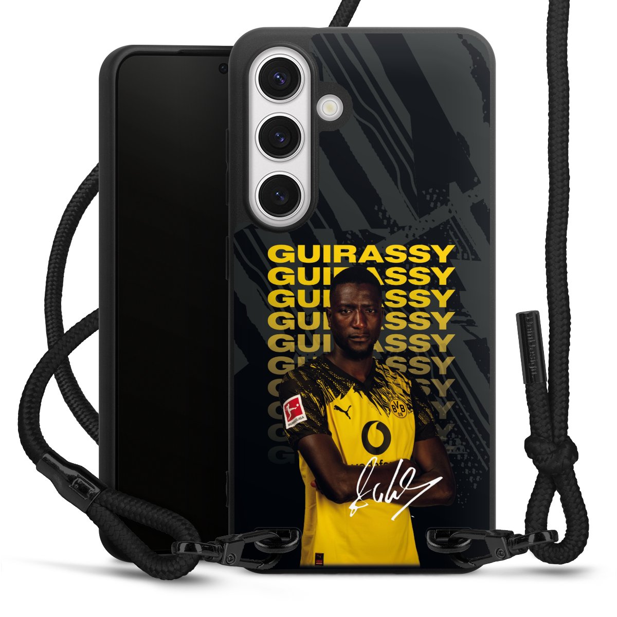 The matt black silicone case is made of flexible TPU (thermoplastic polyurethane) and offers robust protection. The durable, unbreakable material makes the cover flexible and dimensionally stable at the same time. The matte surface makes your design stand out more and is less susceptible to fingerprints and dirt. The stylish trend accessory fits comfortably in the hand and is perfectly complemented by the fabric (polyester) mobile phone strap. The braided fabric strap is approx. 1.70 metres long with a diameter of approx. 0.5 cm. Due to the special knotting technique, the length of the strap can be adjusted by simply pulling it, so that you can adapt it individually to your wishes. The practical case to wear around your neck is available with the fabric strap in black. As a little icing on the cake, we have provided the strap with a chic metal fastener in matt black. The strap is securely fastened to the case with loops made of high-quality genuine leather and press studs. The ends of the fabric strap are covered with metallic end caps and thus protected from fraying.