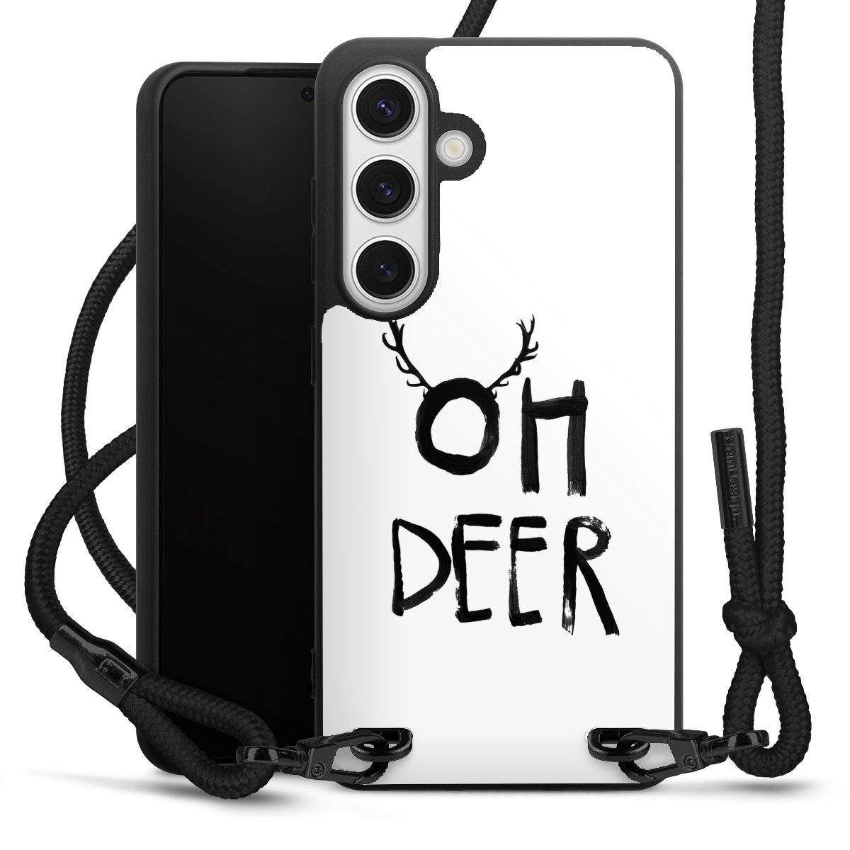 The matt black silicone case is made of flexible TPU (thermoplastic polyurethane) and offers robust protection. The durable, unbreakable material makes the cover flexible and dimensionally stable at the same time. The matte surface makes your design stand out more and is less susceptible to fingerprints and dirt. The stylish trend accessory fits comfortably in the hand and is perfectly complemented by the fabric (polyester) mobile phone strap. The braided fabric strap is approx. 1.70 metres long with a diameter of approx. 0.5 cm. Due to the special knotting technique, the length of the strap can be adjusted by simply pulling it, so that you can adapt it individually to your wishes. The practical case to wear around your neck is available with the fabric strap in black. As a little icing on the cake, we have provided the strap with a chic metal fastener in matt black. The strap is securely fastened to the case with loops made of high-quality genuine leather and press studs. The ends of the fabric strap are covered with metallic end caps and thus protected from fraying.