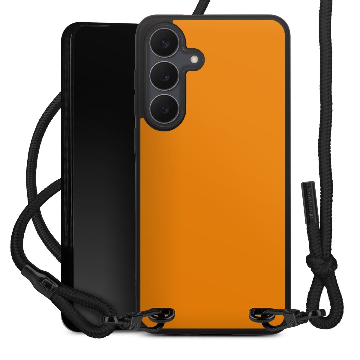 The matt black silicone case is made of flexible TPU (thermoplastic polyurethane) and offers robust protection. The durable, unbreakable material makes the cover flexible and dimensionally stable at the same time. The matte surface makes your design stand out more and is less susceptible to fingerprints and dirt. The stylish trend accessory fits comfortably in the hand and is perfectly complemented by the fabric (polyester) mobile phone strap. The braided fabric strap is approx. 1.70 metres long with a diameter of approx. 0.5 cm. Due to the special knotting technique, the length of the strap can be adjusted by simply pulling it, so that you can adapt it individually to your wishes. The practical case to wear around your neck is available with the fabric strap in black. As a little icing on the cake, we have provided the strap with a chic metal fastener in matt black. The strap is securely fastened to the case with loops made of high-quality genuine leather and press studs. The ends of the fabric strap are covered with metallic end caps and thus protected from fraying.