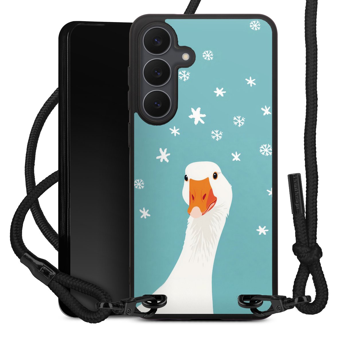 The matt black silicone case is made of flexible TPU (thermoplastic polyurethane) and offers robust protection. The durable, unbreakable material makes the cover flexible and dimensionally stable at the same time. The matte surface makes your design stand out more and is less susceptible to fingerprints and dirt. The stylish trend accessory fits comfortably in the hand and is perfectly complemented by the fabric (polyester) mobile phone strap. The braided fabric strap is approx. 1.70 metres long with a diameter of approx. 0.5 cm. Due to the special knotting technique, the length of the strap can be adjusted by simply pulling it, so that you can adapt it individually to your wishes. The practical case to wear around your neck is available with the fabric strap in black. As a little icing on the cake, we have provided the strap with a chic metal fastener in matt black. The strap is securely fastened to the case with loops made of high-quality genuine leather and press studs. The ends of the fabric strap are covered with metallic end caps and thus protected from fraying.