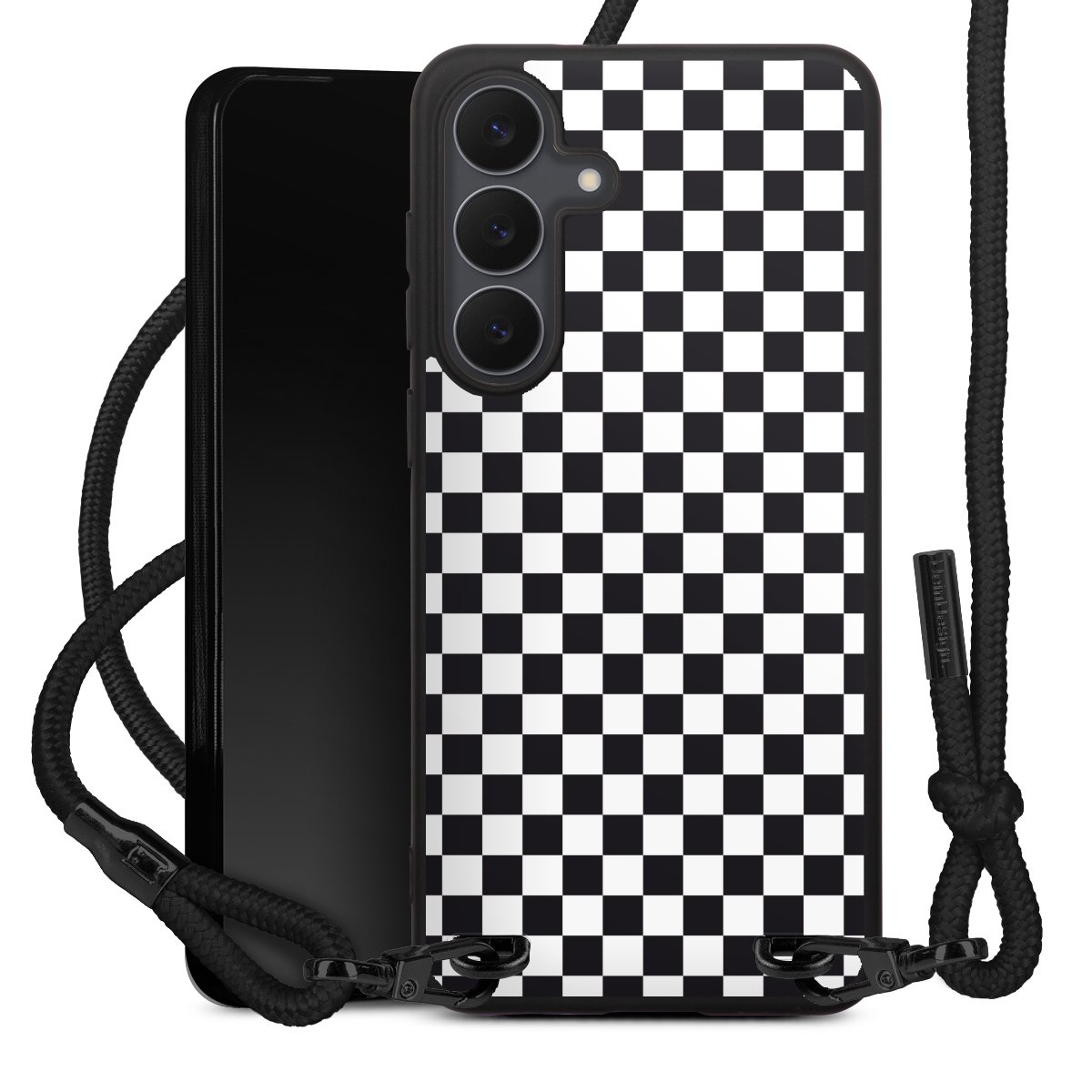 The matt black silicone case is made of flexible TPU (thermoplastic polyurethane) and offers robust protection. The durable, unbreakable material makes the cover flexible and dimensionally stable at the same time. The matte surface makes your design stand out more and is less susceptible to fingerprints and dirt. The stylish trend accessory fits comfortably in the hand and is perfectly complemented by the fabric (polyester) mobile phone strap. The braided fabric strap is approx. 1.70 metres long with a diameter of approx. 0.5 cm. Due to the special knotting technique, the length of the strap can be adjusted by simply pulling it, so that you can adapt it individually to your wishes. The practical case to wear around your neck is available with the fabric strap in black. As a little icing on the cake, we have provided the strap with a chic metal fastener in matt black. The strap is securely fastened to the case with loops made of high-quality genuine leather and press studs. The ends of the fabric strap are covered with metallic end caps and thus protected from fraying.