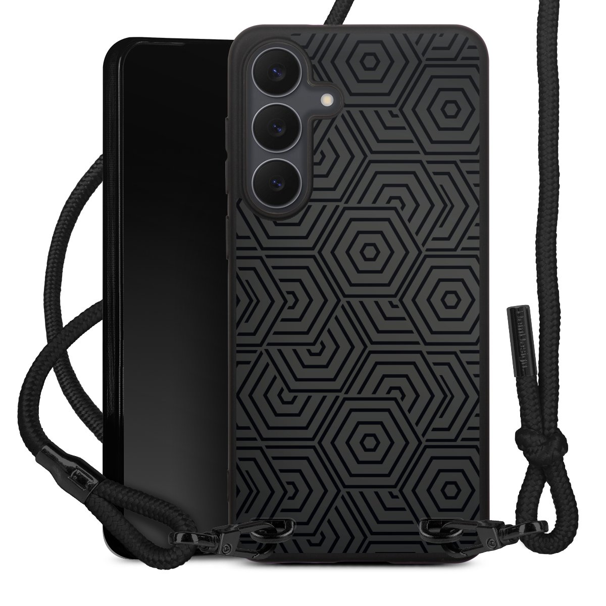 Pure Black: Phone case, fabric strap and metal details in stylish matt black.