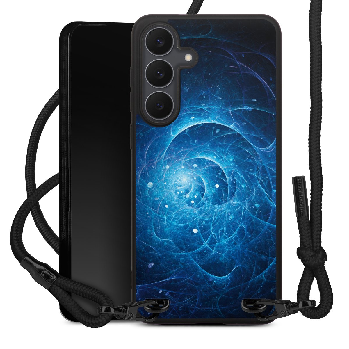 The matt black silicone case is made of flexible TPU (thermoplastic polyurethane) and offers robust protection. The durable, unbreakable material makes the cover flexible and dimensionally stable at the same time. The matte surface makes your design stand out more and is less susceptible to fingerprints and dirt. The stylish trend accessory fits comfortably in the hand and is perfectly complemented by the fabric (polyester) mobile phone strap. The braided fabric strap is approx. 1.70 metres long with a diameter of approx. 0.5 cm. Due to the special knotting technique, the length of the strap can be adjusted by simply pulling it, so that you can adapt it individually to your wishes. The practical case to wear around your neck is available with the fabric strap in black. As a little icing on the cake, we have provided the strap with a chic metal fastener in matt black. The strap is securely fastened to the case with loops made of high-quality genuine leather and press studs. The ends of the fabric strap are covered with metallic end caps and thus protected from fraying.