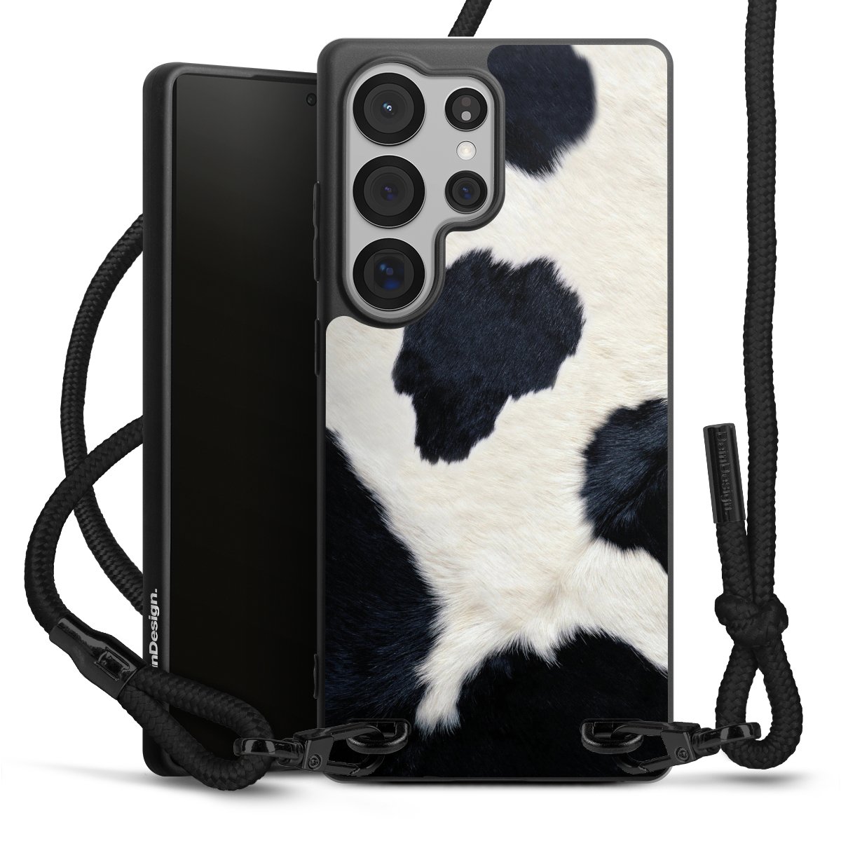 The matt black silicone case is made of flexible TPU (thermoplastic polyurethane) and offers robust protection. The durable, unbreakable material makes the cover flexible and dimensionally stable at the same time. The matte surface makes your design stand out more and is less susceptible to fingerprints and dirt. The stylish trend accessory fits comfortably in the hand and is perfectly complemented by the fabric (polyester) mobile phone strap. The braided fabric strap is approx. 1.70 metres long with a diameter of approx. 0.5 cm. Due to the special knotting technique, the length of the strap can be adjusted by simply pulling it, so that you can adapt it individually to your wishes. The practical case to wear around your neck is available with the fabric strap in black. As a little icing on the cake, we have provided the strap with a chic metal fastener in matt black. The strap is securely fastened to the case with loops made of high-quality genuine leather and press studs. The ends of the fabric strap are covered with metallic end caps and thus protected from fraying.