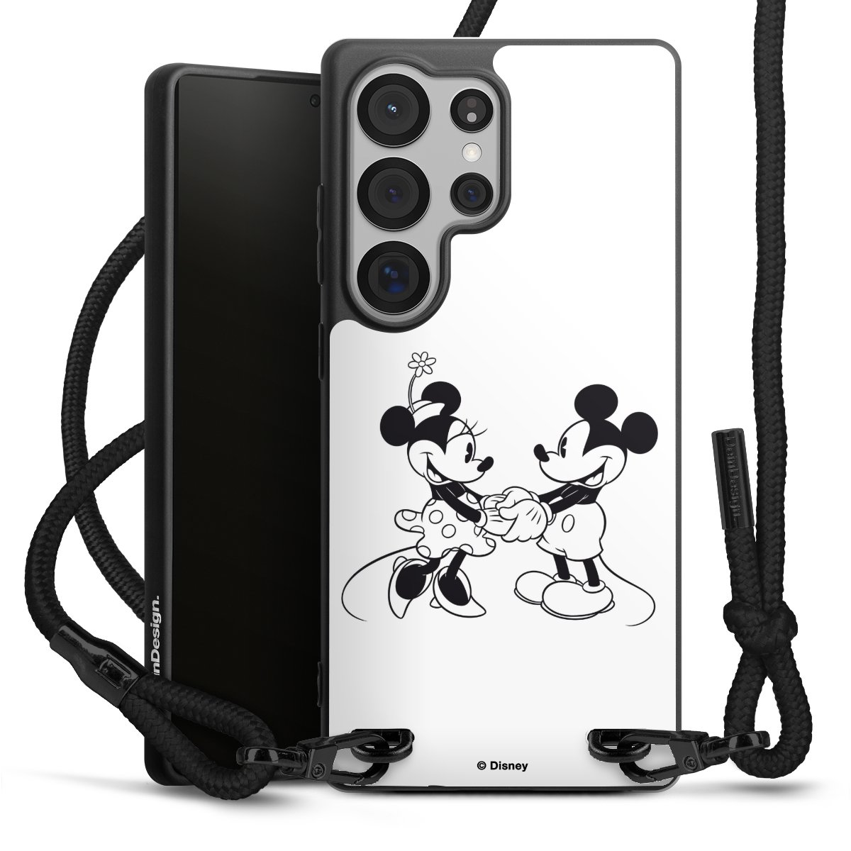 The matt black silicone case is made of flexible TPU (thermoplastic polyurethane) and offers robust protection. The durable, unbreakable material makes the cover flexible and dimensionally stable at the same time. The matte surface makes your design stand out more and is less susceptible to fingerprints and dirt. The stylish trend accessory fits comfortably in the hand and is perfectly complemented by the fabric (polyester) mobile phone strap. The braided fabric strap is approx. 1.70 metres long with a diameter of approx. 0.5 cm. Due to the special knotting technique, the length of the strap can be adjusted by simply pulling it, so that you can adapt it individually to your wishes. The practical case to wear around your neck is available with the fabric strap in black. As a little icing on the cake, we have provided the strap with a chic metal fastener in matt black. The strap is securely fastened to the case with loops made of high-quality genuine leather and press studs. The ends of the fabric strap are covered with metallic end caps and thus protected from fraying.