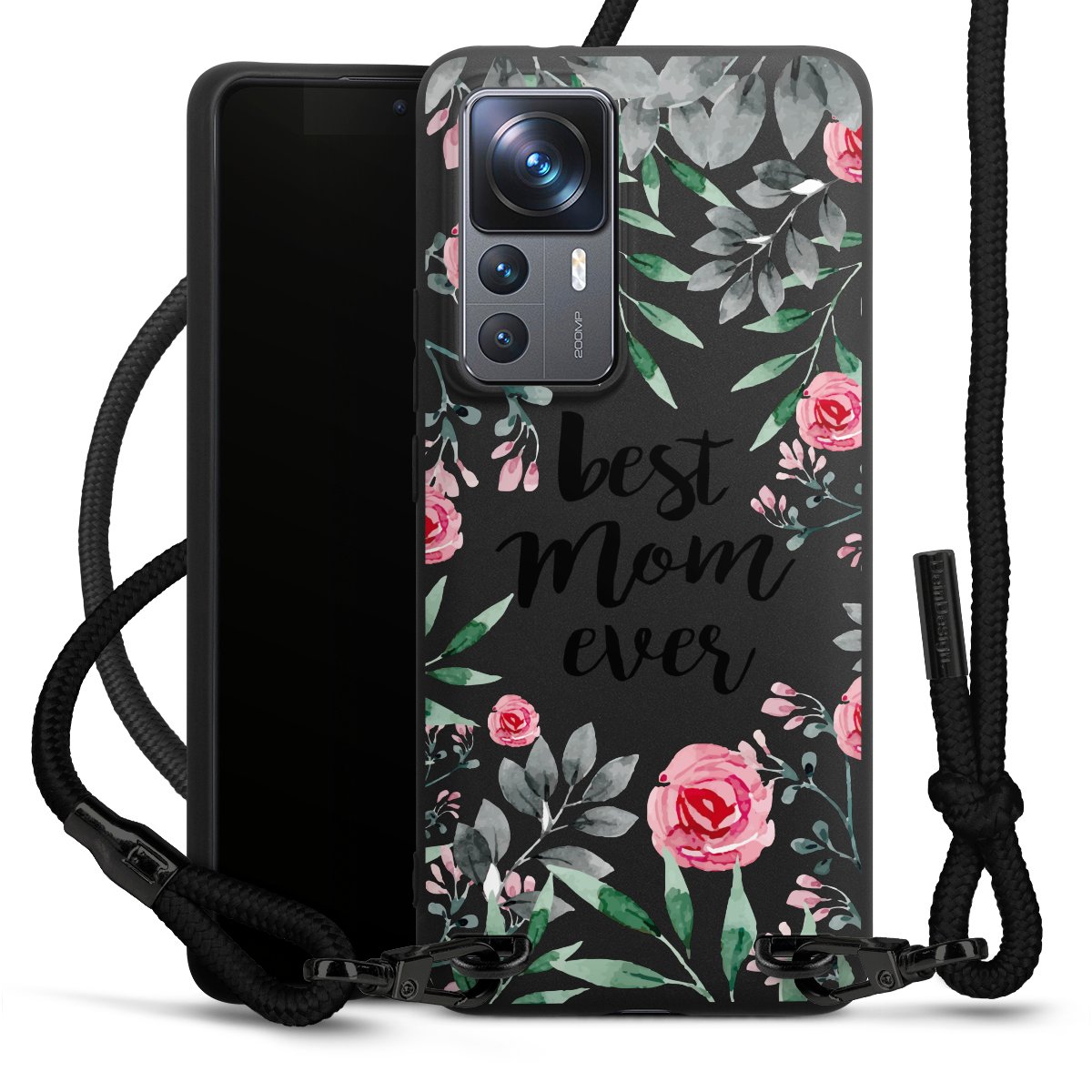 The matt black silicone case is made of flexible TPU (thermoplastic polyurethane) and offers robust protection. The durable, unbreakable material makes the cover flexible and dimensionally stable at the same time. The matte surface makes your design stand out more and is less susceptible to fingerprints and dirt. The stylish trend accessory fits comfortably in the hand and is perfectly complemented by the fabric (polyester) mobile phone strap. The braided fabric strap is approx. 1.70 metres long with a diameter of approx. 0.5 cm. Due to the special knotting technique, the length of the strap can be adjusted by simply pulling it, so that you can adapt it individually to your wishes. The practical case to wear around your neck is available with the fabric strap in black. As a little icing on the cake, we have provided the strap with a chic metal fastener in matt black. The strap is securely fastened to the case with loops made of high-quality genuine leather and press studs. The ends of the fabric strap are covered with metallic end caps and thus protected from fraying.