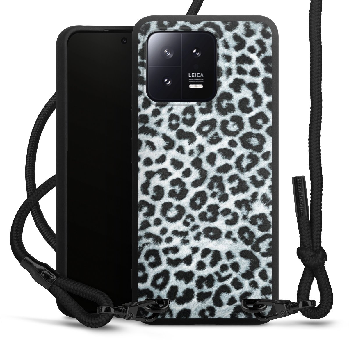 The matt black silicone case is made of flexible TPU (thermoplastic polyurethane) and offers robust protection. The durable, unbreakable material makes the cover flexible and dimensionally stable at the same time. The matte surface makes your design stand out more and is less susceptible to fingerprints and dirt. The stylish trend accessory fits comfortably in the hand and is perfectly complemented by the fabric (polyester) mobile phone strap. The braided fabric strap is approx. 1.70 metres long with a diameter of approx. 0.5 cm. Due to the special knotting technique, the length of the strap can be adjusted by simply pulling it, so that you can adapt it individually to your wishes. The practical case to wear around your neck is available with the fabric strap in black. As a little icing on the cake, we have provided the strap with a chic metal fastener in matt black. The strap is securely fastened to the case with loops made of high-quality genuine leather and press studs. The ends of the fabric strap are covered with metallic end caps and thus protected from fraying.