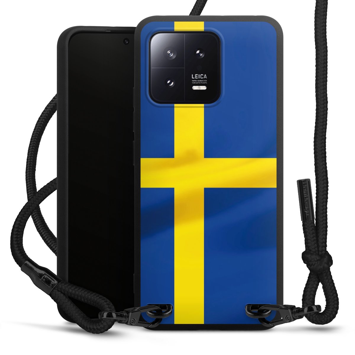 The matt black silicone case is made of flexible TPU (thermoplastic polyurethane) and offers robust protection. The durable, unbreakable material makes the cover flexible and dimensionally stable at the same time. The matte surface makes your design stand out more and is less susceptible to fingerprints and dirt. The stylish trend accessory fits comfortably in the hand and is perfectly complemented by the fabric (polyester) mobile phone strap. The braided fabric strap is approx. 1.70 metres long with a diameter of approx. 0.5 cm. Due to the special knotting technique, the length of the strap can be adjusted by simply pulling it, so that you can adapt it individually to your wishes. The practical case to wear around your neck is available with the fabric strap in black. As a little icing on the cake, we have provided the strap with a chic metal fastener in matt black. The strap is securely fastened to the case with loops made of high-quality genuine leather and press studs. The ends of the fabric strap are covered with metallic end caps and thus protected from fraying.