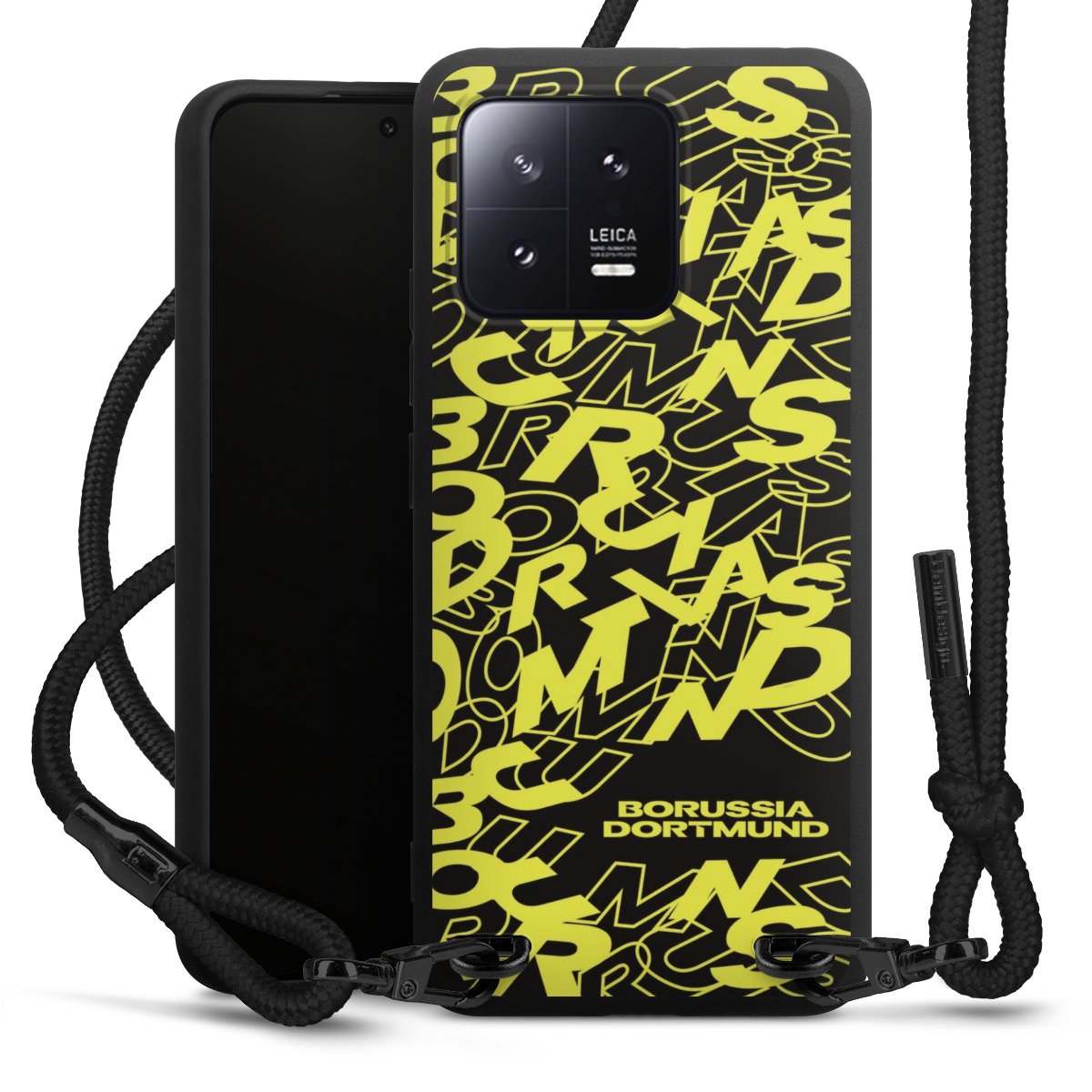 The matt black silicone case is made of flexible TPU (thermoplastic polyurethane) and offers robust protection. The durable, unbreakable material makes the cover flexible and dimensionally stable at the same time. The matte surface makes your design stand out more and is less susceptible to fingerprints and dirt. The stylish trend accessory fits comfortably in the hand and is perfectly complemented by the fabric (polyester) mobile phone strap. The braided fabric strap is approx. 1.70 metres long with a diameter of approx. 0.5 cm. Due to the special knotting technique, the length of the strap can be adjusted by simply pulling it, so that you can adapt it individually to your wishes. The practical case to wear around your neck is available with the fabric strap in black. As a little icing on the cake, we have provided the strap with a chic metal fastener in matt black. The strap is securely fastened to the case with loops made of high-quality genuine leather and press studs. The ends of the fabric strap are covered with metallic end caps and thus protected from fraying.