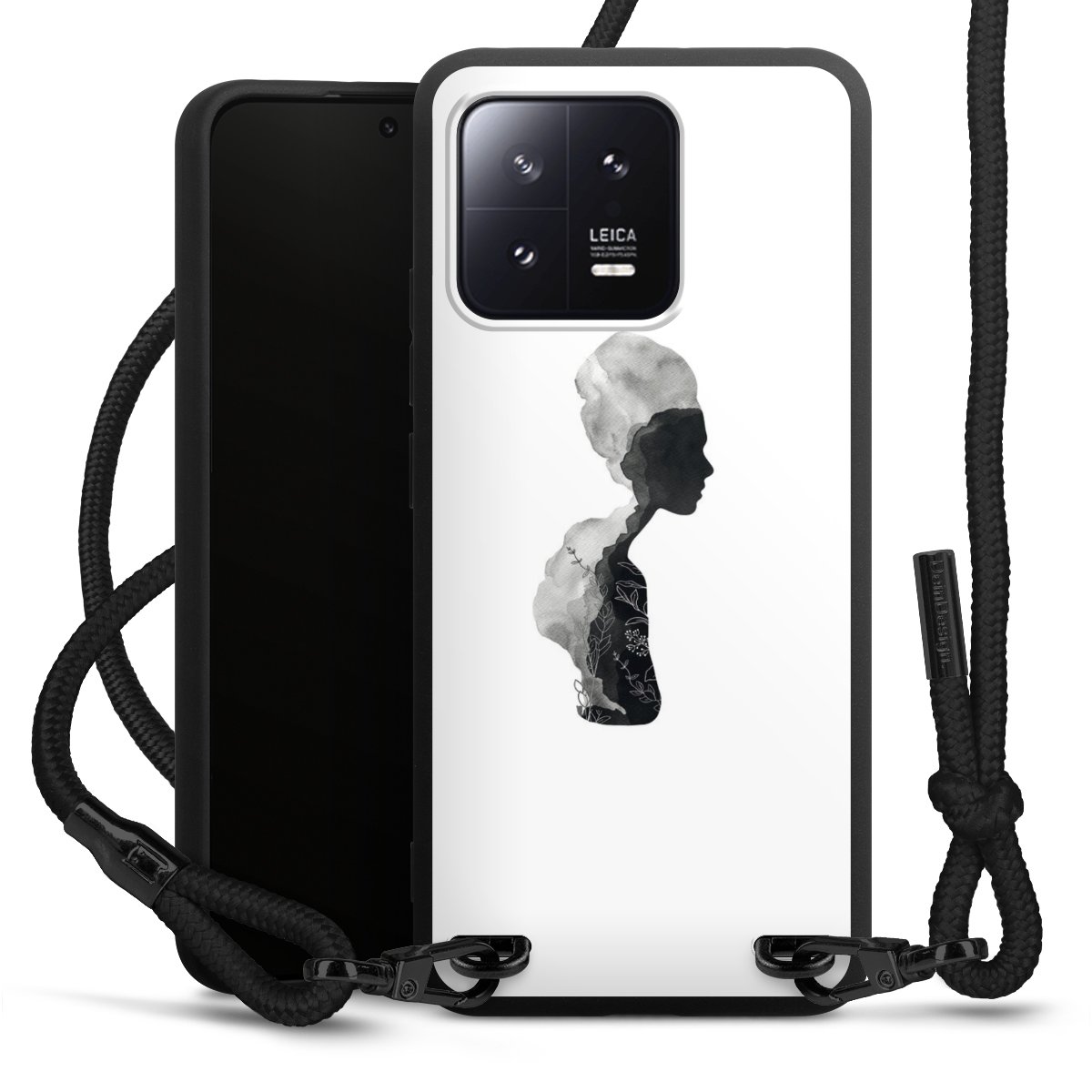 The matt black silicone case is made of flexible TPU (thermoplastic polyurethane) and offers robust protection. The durable, unbreakable material makes the cover flexible and dimensionally stable at the same time. The matte surface makes your design stand out more and is less susceptible to fingerprints and dirt. The stylish trend accessory fits comfortably in the hand and is perfectly complemented by the fabric (polyester) mobile phone strap. The braided fabric strap is approx. 1.70 metres long with a diameter of approx. 0.5 cm. Due to the special knotting technique, the length of the strap can be adjusted by simply pulling it, so that you can adapt it individually to your wishes. The practical case to wear around your neck is available with the fabric strap in black. As a little icing on the cake, we have provided the strap with a chic metal fastener in matt black. The strap is securely fastened to the case with loops made of high-quality genuine leather and press studs. The ends of the fabric strap are covered with metallic end caps and thus protected from fraying.