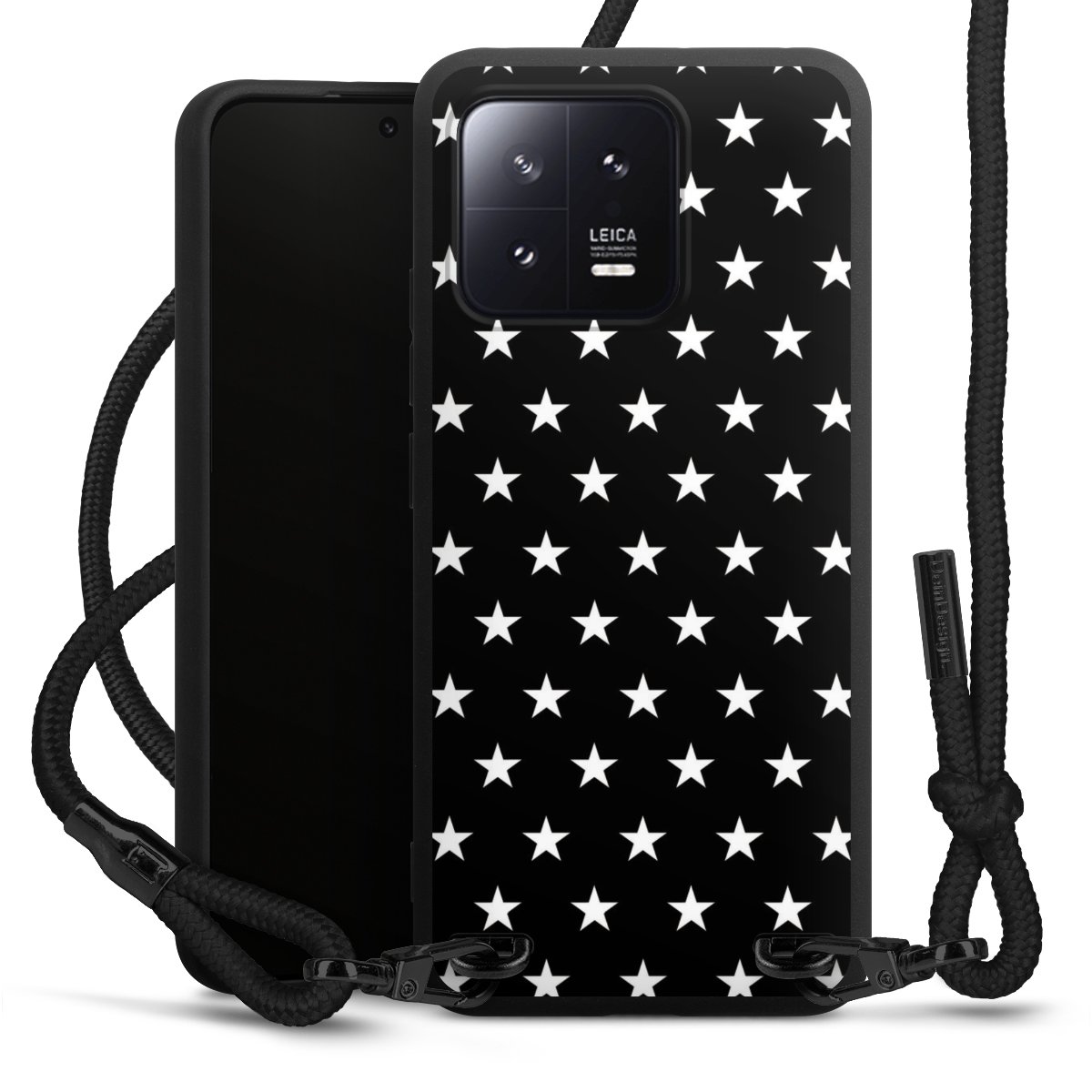 The matt black silicone case is made of flexible TPU (thermoplastic polyurethane) and offers robust protection. The durable, unbreakable material makes the cover flexible and dimensionally stable at the same time. The matte surface makes your design stand out more and is less susceptible to fingerprints and dirt. The stylish trend accessory fits comfortably in the hand and is perfectly complemented by the fabric (polyester) mobile phone strap. The braided fabric strap is approx. 1.70 metres long with a diameter of approx. 0.5 cm. Due to the special knotting technique, the length of the strap can be adjusted by simply pulling it, so that you can adapt it individually to your wishes. The practical case to wear around your neck is available with the fabric strap in black. As a little icing on the cake, we have provided the strap with a chic metal fastener in matt black. The strap is securely fastened to the case with loops made of high-quality genuine leather and press studs. The ends of the fabric strap are covered with metallic end caps and thus protected from fraying.