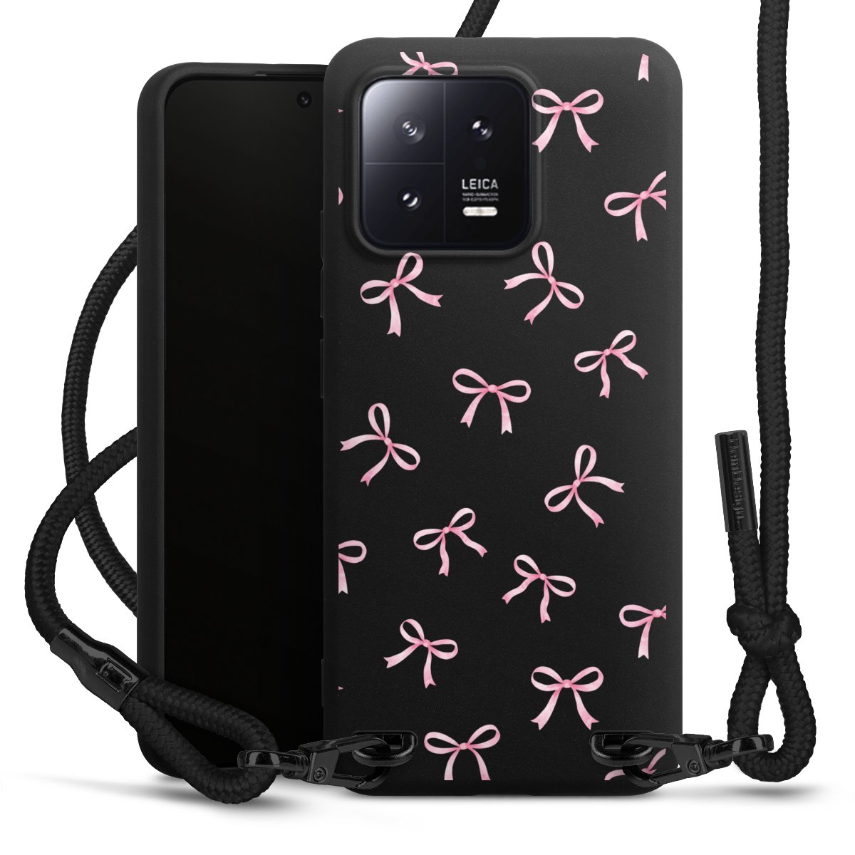 The matt black silicone case is made of flexible TPU (thermoplastic polyurethane) and offers robust protection. The durable, unbreakable material makes the cover flexible and dimensionally stable at the same time. The matte surface makes your design stand out more and is less susceptible to fingerprints and dirt. The stylish trend accessory fits comfortably in the hand and is perfectly complemented by the fabric (polyester) mobile phone strap. The braided fabric strap is approx. 1.70 metres long with a diameter of approx. 0.5 cm. Due to the special knotting technique, the length of the strap can be adjusted by simply pulling it, so that you can adapt it individually to your wishes. The practical case to wear around your neck is available with the fabric strap in black. As a little icing on the cake, we have provided the strap with a chic metal fastener in matt black. The strap is securely fastened to the case with loops made of high-quality genuine leather and press studs. The ends of the fabric strap are covered with metallic end caps and thus protected from fraying.