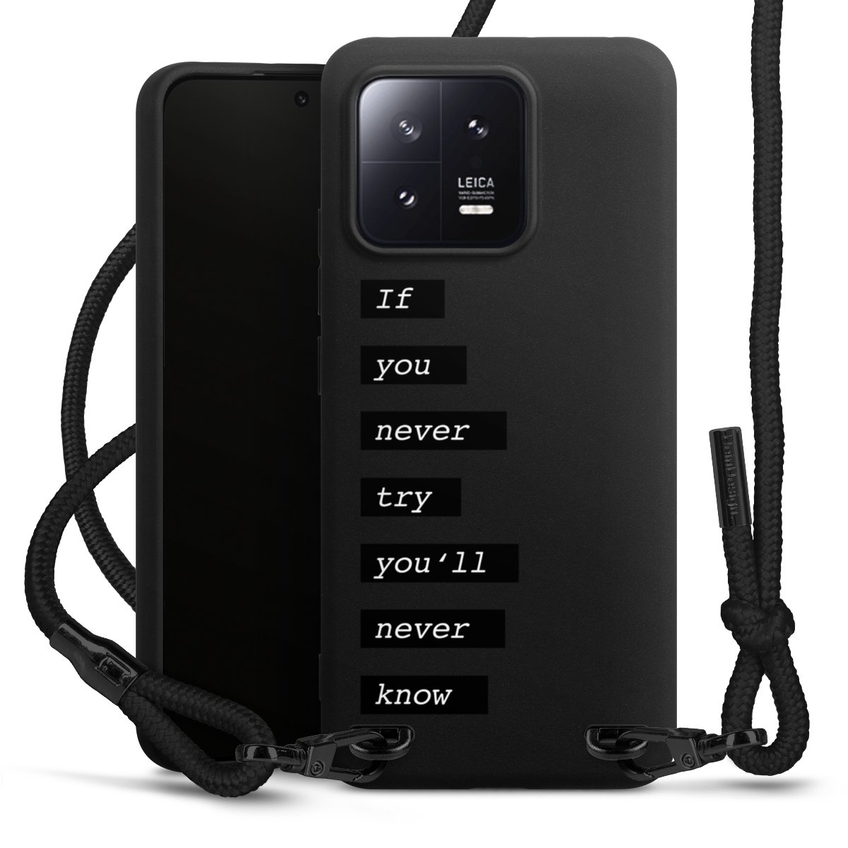 The matt black silicone case is made of flexible TPU (thermoplastic polyurethane) and offers robust protection. The durable, unbreakable material makes the cover flexible and dimensionally stable at the same time. The matte surface makes your design stand out more and is less susceptible to fingerprints and dirt. The stylish trend accessory fits comfortably in the hand and is perfectly complemented by the fabric (polyester) mobile phone strap. The braided fabric strap is approx. 1.70 metres long with a diameter of approx. 0.5 cm. Due to the special knotting technique, the length of the strap can be adjusted by simply pulling it, so that you can adapt it individually to your wishes. The practical case to wear around your neck is available with the fabric strap in black. As a little icing on the cake, we have provided the strap with a chic metal fastener in matt black. The strap is securely fastened to the case with loops made of high-quality genuine leather and press studs. The ends of the fabric strap are covered with metallic end caps and thus protected from fraying.