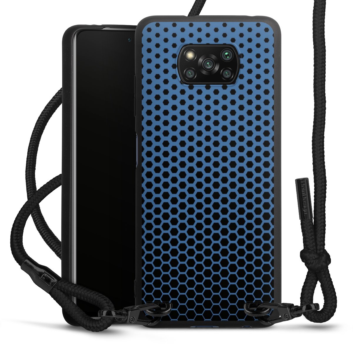 The matt black silicone case is made of flexible TPU (thermoplastic polyurethane) and offers robust protection. The durable, unbreakable material makes the cover flexible and dimensionally stable at the same time. The matte surface makes your design stand out more and is less susceptible to fingerprints and dirt. The stylish trend accessory fits comfortably in the hand and is perfectly complemented by the fabric (polyester) mobile phone strap. The braided fabric strap is approx. 1.70 metres long with a diameter of approx. 0.5 cm. Due to the special knotting technique, the length of the strap can be adjusted by simply pulling it, so that you can adapt it individually to your wishes. The practical case to wear around your neck is available with the fabric strap in black. As a little icing on the cake, we have provided the strap with a chic metal fastener in matt black. The strap is securely fastened to the case with loops made of high-quality genuine leather and press studs. The ends of the fabric strap are covered with metallic end caps and thus protected from fraying.