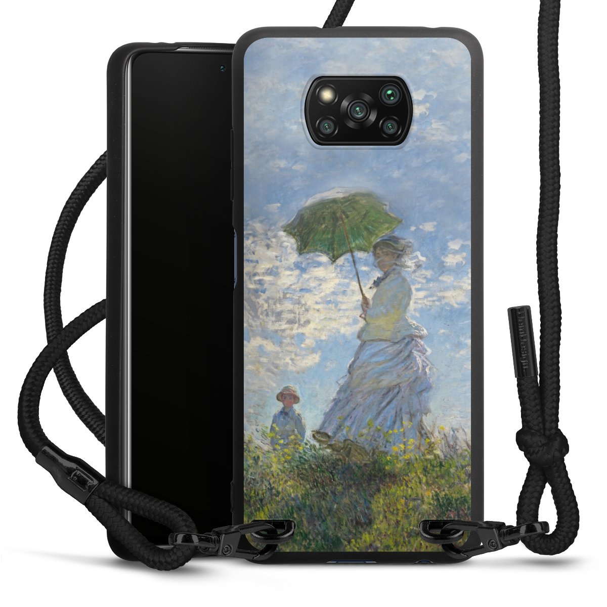 The matt black silicone case is made of flexible TPU (thermoplastic polyurethane) and offers robust protection. The durable, unbreakable material makes the cover flexible and dimensionally stable at the same time. The matte surface makes your design stand out more and is less susceptible to fingerprints and dirt. The stylish trend accessory fits comfortably in the hand and is perfectly complemented by the fabric (polyester) mobile phone strap. The braided fabric strap is approx. 1.70 metres long with a diameter of approx. 0.5 cm. Due to the special knotting technique, the length of the strap can be adjusted by simply pulling it, so that you can adapt it individually to your wishes. The practical case to wear around your neck is available with the fabric strap in black. As a little icing on the cake, we have provided the strap with a chic metal fastener in matt black. The strap is securely fastened to the case with loops made of high-quality genuine leather and press studs. The ends of the fabric strap are covered with metallic end caps and thus protected from fraying.