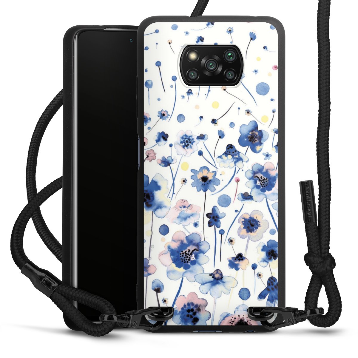 The matt black silicone case is made of flexible TPU (thermoplastic polyurethane) and offers robust protection. The durable, unbreakable material makes the cover flexible and dimensionally stable at the same time. The matte surface makes your design stand out more and is less susceptible to fingerprints and dirt. The stylish trend accessory fits comfortably in the hand and is perfectly complemented by the fabric (polyester) mobile phone strap. The braided fabric strap is approx. 1.70 metres long with a diameter of approx. 0.5 cm. Due to the special knotting technique, the length of the strap can be adjusted by simply pulling it, so that you can adapt it individually to your wishes. The practical case to wear around your neck is available with the fabric strap in black. As a little icing on the cake, we have provided the strap with a chic metal fastener in matt black. The strap is securely fastened to the case with loops made of high-quality genuine leather and press studs. The ends of the fabric strap are covered with metallic end caps and thus protected from fraying.