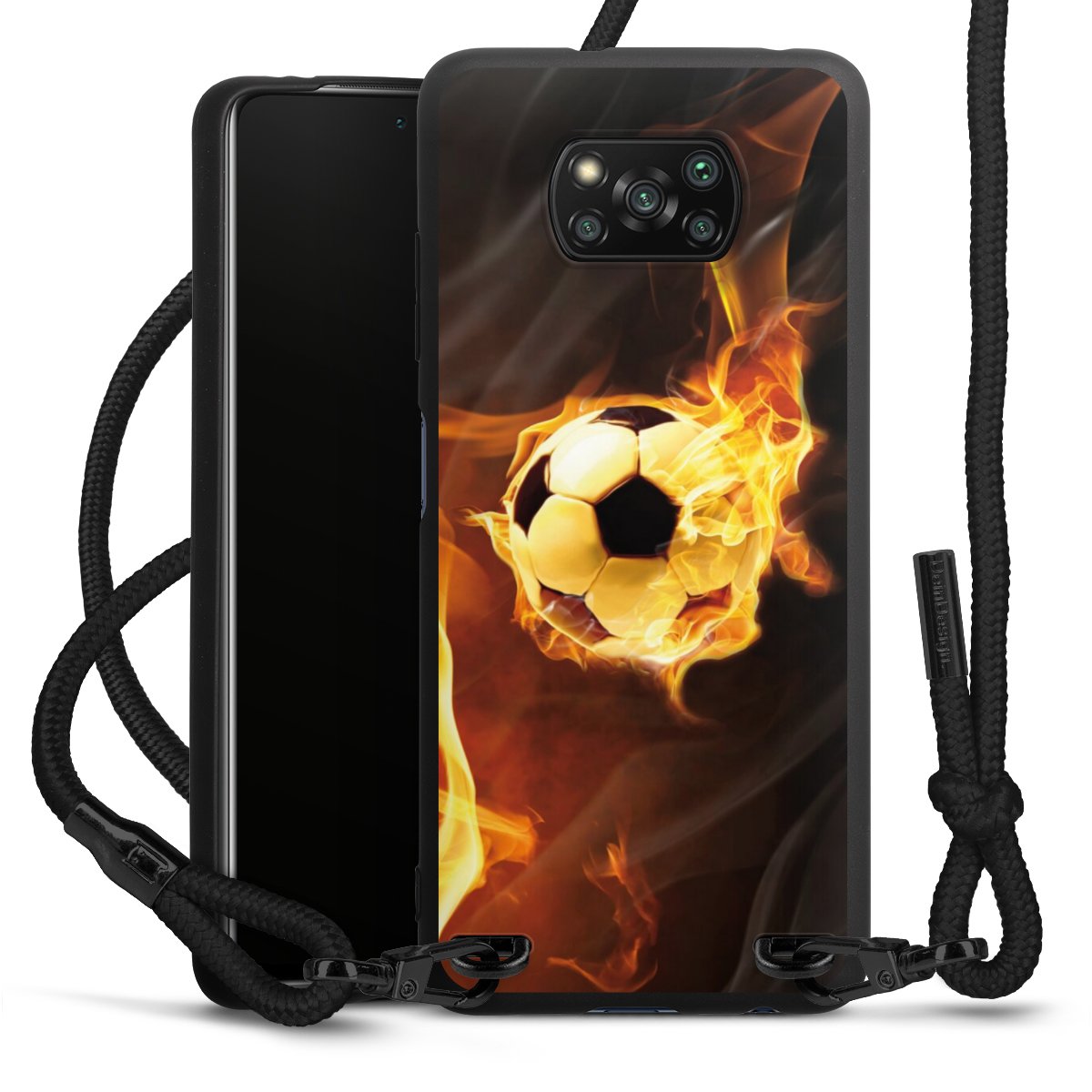 The matt black silicone case is made of flexible TPU (thermoplastic polyurethane) and offers robust protection. The durable, unbreakable material makes the cover flexible and dimensionally stable at the same time. The matte surface makes your design stand out more and is less susceptible to fingerprints and dirt. The stylish trend accessory fits comfortably in the hand and is perfectly complemented by the fabric (polyester) mobile phone strap. The braided fabric strap is approx. 1.70 metres long with a diameter of approx. 0.5 cm. Due to the special knotting technique, the length of the strap can be adjusted by simply pulling it, so that you can adapt it individually to your wishes. The practical case to wear around your neck is available with the fabric strap in black. As a little icing on the cake, we have provided the strap with a chic metal fastener in matt black. The strap is securely fastened to the case with loops made of high-quality genuine leather and press studs. The ends of the fabric strap are covered with metallic end caps and thus protected from fraying.