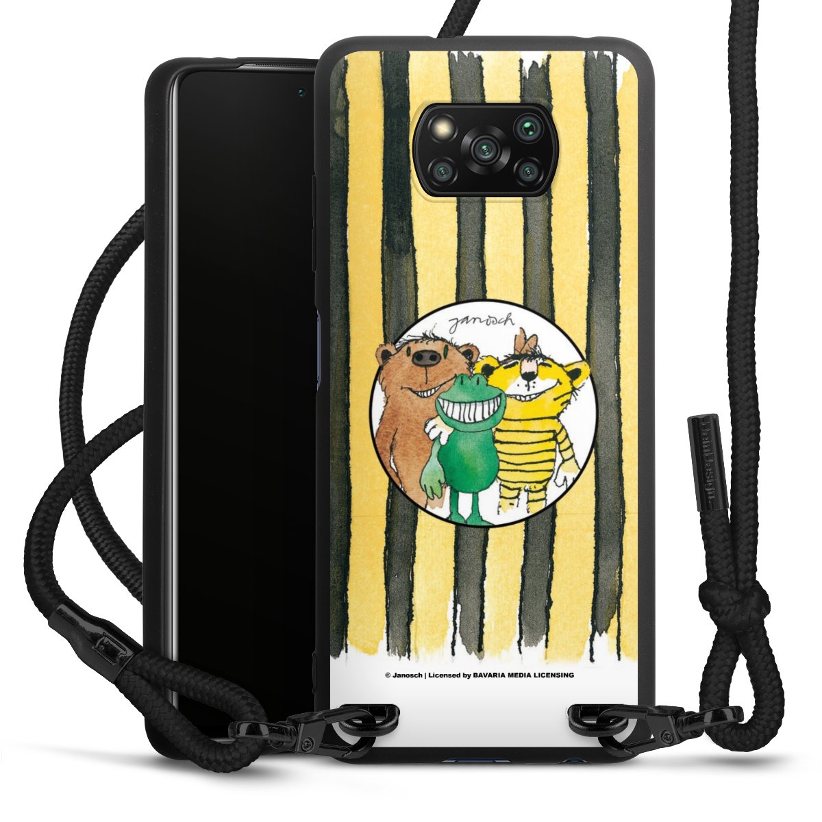 The matt black silicone case is made of flexible TPU (thermoplastic polyurethane) and offers robust protection. The durable, unbreakable material makes the cover flexible and dimensionally stable at the same time. The matte surface makes your design stand out more and is less susceptible to fingerprints and dirt. The stylish trend accessory fits comfortably in the hand and is perfectly complemented by the fabric (polyester) mobile phone strap. The braided fabric strap is approx. 1.70 metres long with a diameter of approx. 0.5 cm. Due to the special knotting technique, the length of the strap can be adjusted by simply pulling it, so that you can adapt it individually to your wishes. The practical case to wear around your neck is available with the fabric strap in black. As a little icing on the cake, we have provided the strap with a chic metal fastener in matt black. The strap is securely fastened to the case with loops made of high-quality genuine leather and press studs. The ends of the fabric strap are covered with metallic end caps and thus protected from fraying.