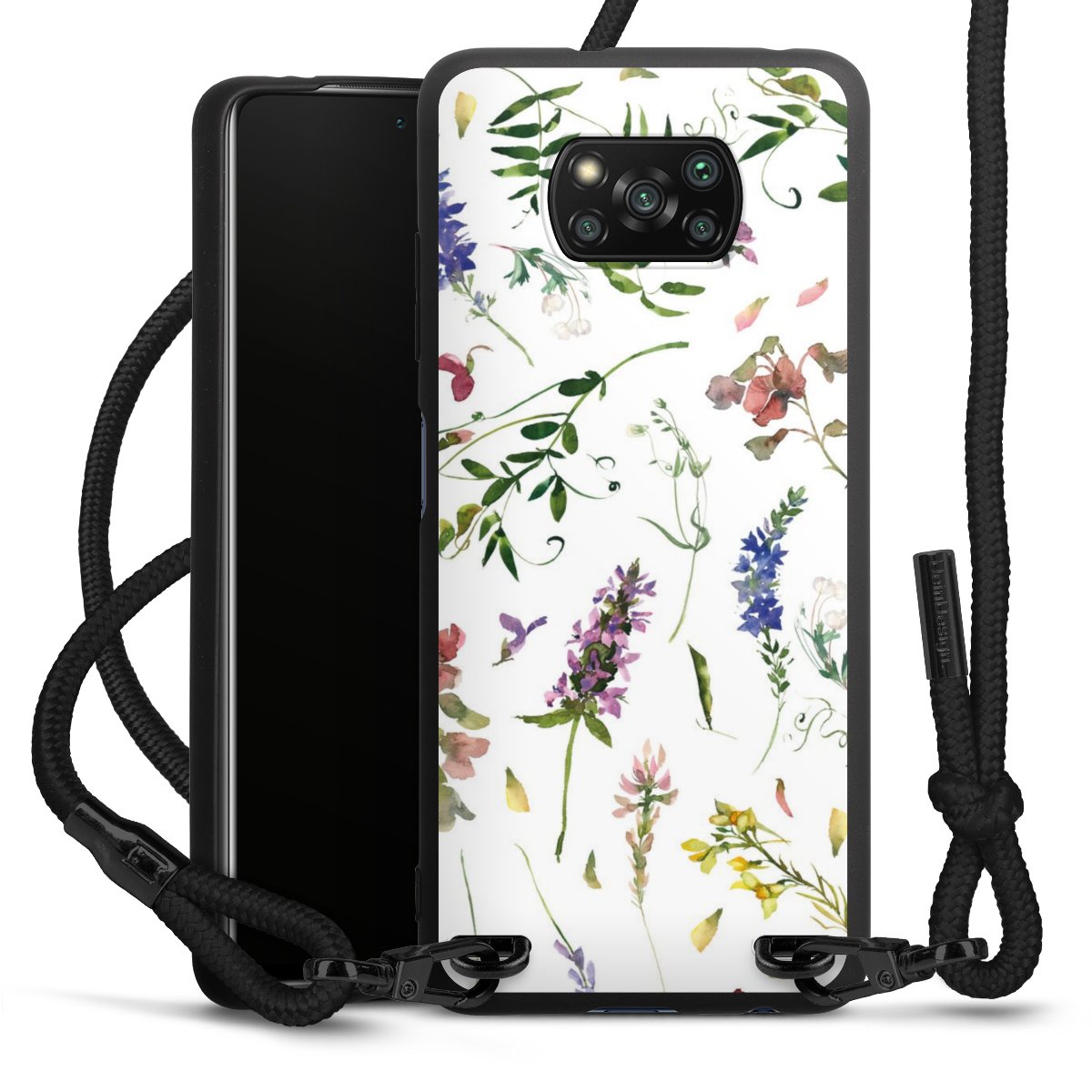 The matt black silicone case is made of flexible TPU (thermoplastic polyurethane) and offers robust protection. The durable, unbreakable material makes the cover flexible and dimensionally stable at the same time. The matte surface makes your design stand out more and is less susceptible to fingerprints and dirt. The stylish trend accessory fits comfortably in the hand and is perfectly complemented by the fabric (polyester) mobile phone strap. The braided fabric strap is approx. 1.70 metres long with a diameter of approx. 0.5 cm. Due to the special knotting technique, the length of the strap can be adjusted by simply pulling it, so that you can adapt it individually to your wishes. The practical case to wear around your neck is available with the fabric strap in black. As a little icing on the cake, we have provided the strap with a chic metal fastener in matt black. The strap is securely fastened to the case with loops made of high-quality genuine leather and press studs. The ends of the fabric strap are covered with metallic end caps and thus protected from fraying.