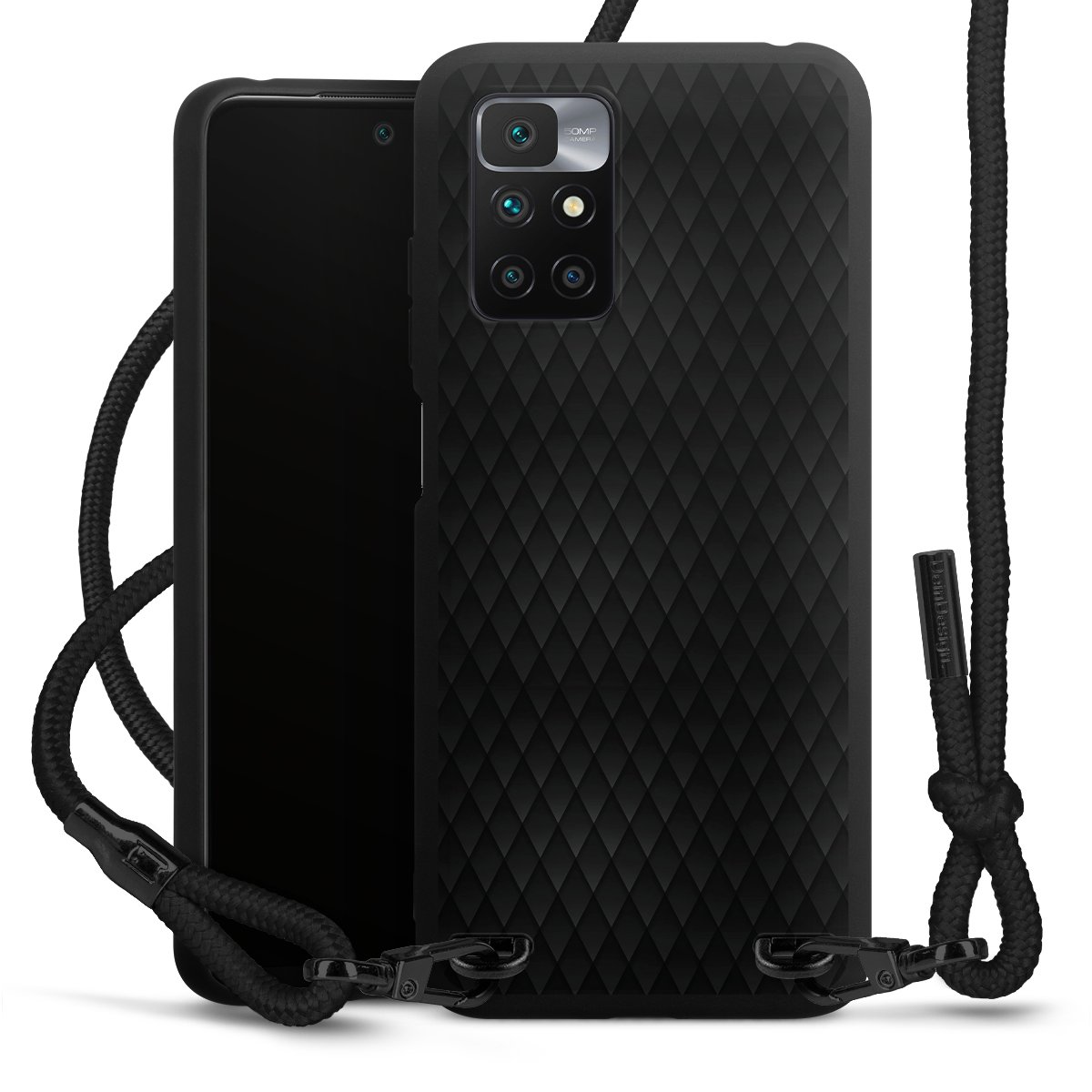 The matt black silicone case is made of flexible TPU (thermoplastic polyurethane) and offers robust protection. The durable, unbreakable material makes the cover flexible and dimensionally stable at the same time. The matte surface makes your design stand out more and is less susceptible to fingerprints and dirt. The stylish trend accessory fits comfortably in the hand and is perfectly complemented by the fabric (polyester) mobile phone strap. The braided fabric strap is approx. 1.70 metres long with a diameter of approx. 0.5 cm. Due to the special knotting technique, the length of the strap can be adjusted by simply pulling it, so that you can adapt it individually to your wishes. The practical case to wear around your neck is available with the fabric strap in black. As a little icing on the cake, we have provided the strap with a chic metal fastener in matt black. The strap is securely fastened to the case with loops made of high-quality genuine leather and press studs. The ends of the fabric strap are covered with metallic end caps and thus protected from fraying.