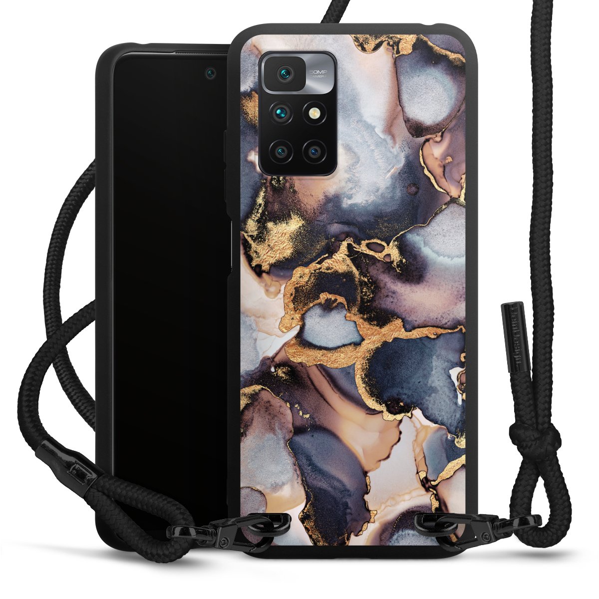 The matt black silicone case is made of flexible TPU (thermoplastic polyurethane) and offers robust protection. The durable, unbreakable material makes the cover flexible and dimensionally stable at the same time. The matte surface makes your design stand out more and is less susceptible to fingerprints and dirt. The stylish trend accessory fits comfortably in the hand and is perfectly complemented by the fabric (polyester) mobile phone strap. The braided fabric strap is approx. 1.70 metres long with a diameter of approx. 0.5 cm. Due to the special knotting technique, the length of the strap can be adjusted by simply pulling it, so that you can adapt it individually to your wishes. The practical case to wear around your neck is available with the fabric strap in black. As a little icing on the cake, we have provided the strap with a chic metal fastener in matt black. The strap is securely fastened to the case with loops made of high-quality genuine leather and press studs. The ends of the fabric strap are covered with metallic end caps and thus protected from fraying.