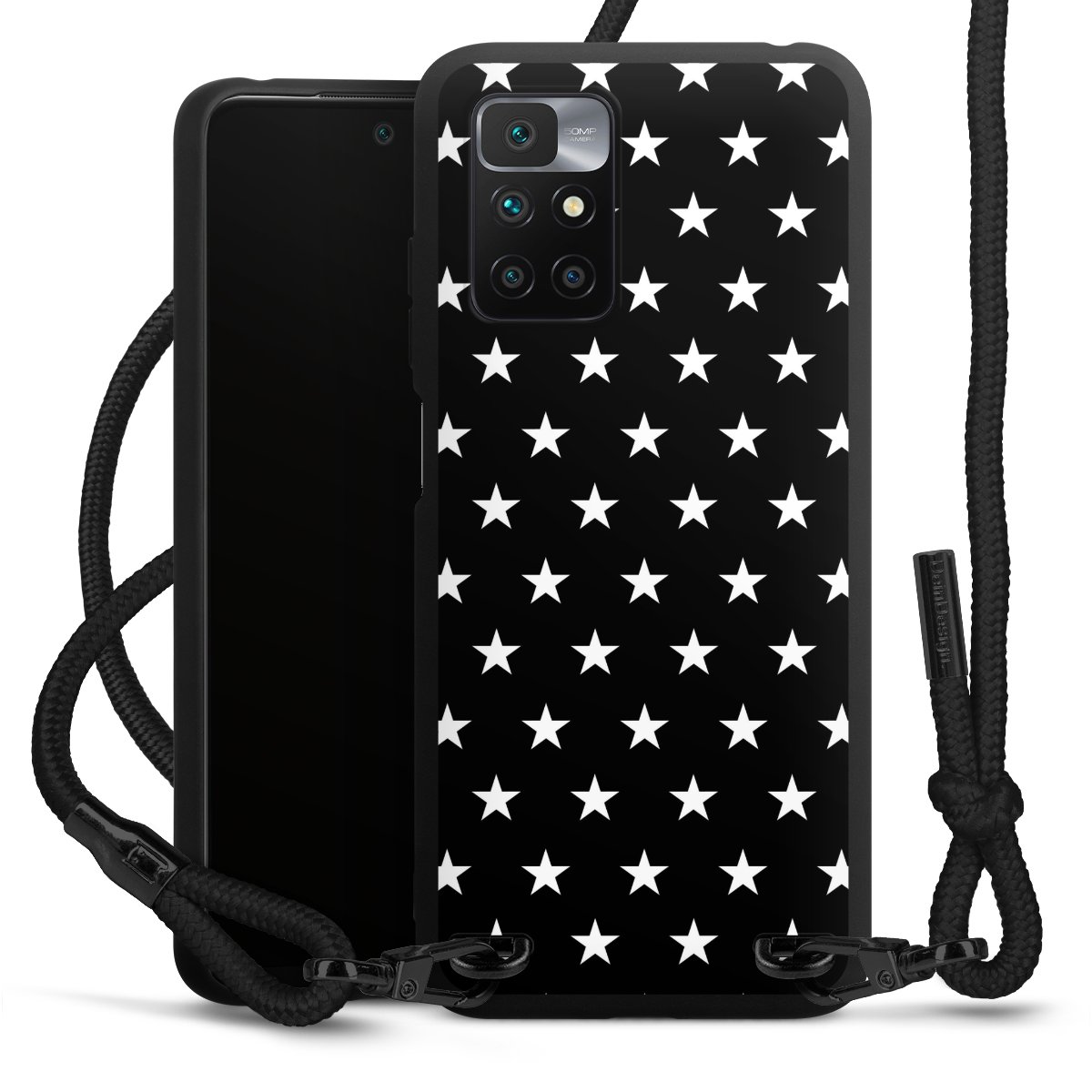 The matt black silicone case is made of flexible TPU (thermoplastic polyurethane) and offers robust protection. The durable, unbreakable material makes the cover flexible and dimensionally stable at the same time. The matte surface makes your design stand out more and is less susceptible to fingerprints and dirt. The stylish trend accessory fits comfortably in the hand and is perfectly complemented by the fabric (polyester) mobile phone strap. The braided fabric strap is approx. 1.70 metres long with a diameter of approx. 0.5 cm. Due to the special knotting technique, the length of the strap can be adjusted by simply pulling it, so that you can adapt it individually to your wishes. The practical case to wear around your neck is available with the fabric strap in black. As a little icing on the cake, we have provided the strap with a chic metal fastener in matt black. The strap is securely fastened to the case with loops made of high-quality genuine leather and press studs. The ends of the fabric strap are covered with metallic end caps and thus protected from fraying.