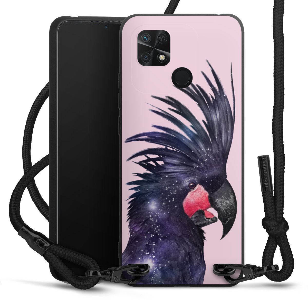 The matt black silicone case is made of flexible TPU (thermoplastic polyurethane) and offers robust protection. The durable, unbreakable material makes the cover flexible and dimensionally stable at the same time. The matte surface makes your design stand out more and is less susceptible to fingerprints and dirt. The stylish trend accessory fits comfortably in the hand and is perfectly complemented by the fabric (polyester) mobile phone strap. The braided fabric strap is approx. 1.70 metres long with a diameter of approx. 0.5 cm. Due to the special knotting technique, the length of the strap can be adjusted by simply pulling it, so that you can adapt it individually to your wishes. The practical case to wear around your neck is available with the fabric strap in black. As a little icing on the cake, we have provided the strap with a chic metal fastener in matt black. The strap is securely fastened to the case with loops made of high-quality genuine leather and press studs. The ends of the fabric strap are covered with metallic end caps and thus protected from fraying.