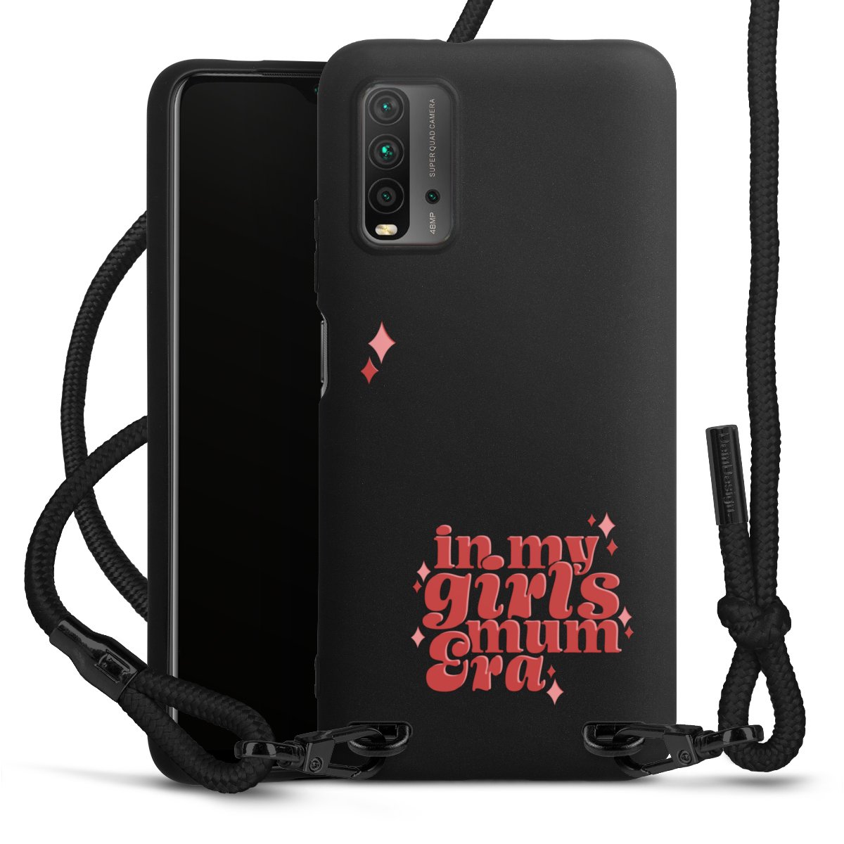The matt black silicone case is made of flexible TPU (thermoplastic polyurethane) and offers robust protection. The durable, unbreakable material makes the cover flexible and dimensionally stable at the same time. The matte surface makes your design stand out more and is less susceptible to fingerprints and dirt. The stylish trend accessory fits comfortably in the hand and is perfectly complemented by the fabric (polyester) mobile phone strap. The braided fabric strap is approx. 1.70 metres long with a diameter of approx. 0.5 cm. Due to the special knotting technique, the length of the strap can be adjusted by simply pulling it, so that you can adapt it individually to your wishes. The practical case to wear around your neck is available with the fabric strap in black. As a little icing on the cake, we have provided the strap with a chic metal fastener in matt black. The strap is securely fastened to the case with loops made of high-quality genuine leather and press studs. The ends of the fabric strap are covered with metallic end caps and thus protected from fraying.