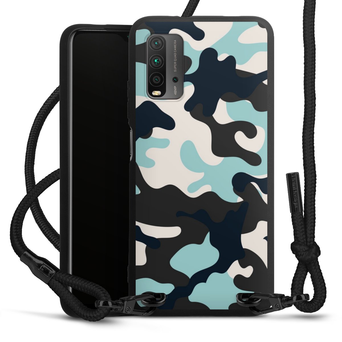 The matt black silicone case is made of flexible TPU (thermoplastic polyurethane) and offers robust protection. The durable, unbreakable material makes the cover flexible and dimensionally stable at the same time. The matte surface makes your design stand out more and is less susceptible to fingerprints and dirt. The stylish trend accessory fits comfortably in the hand and is perfectly complemented by the fabric (polyester) mobile phone strap. The braided fabric strap is approx. 1.70 metres long with a diameter of approx. 0.5 cm. Due to the special knotting technique, the length of the strap can be adjusted by simply pulling it, so that you can adapt it individually to your wishes. The practical case to wear around your neck is available with the fabric strap in black. As a little icing on the cake, we have provided the strap with a chic metal fastener in matt black. The strap is securely fastened to the case with loops made of high-quality genuine leather and press studs. The ends of the fabric strap are covered with metallic end caps and thus protected from fraying.