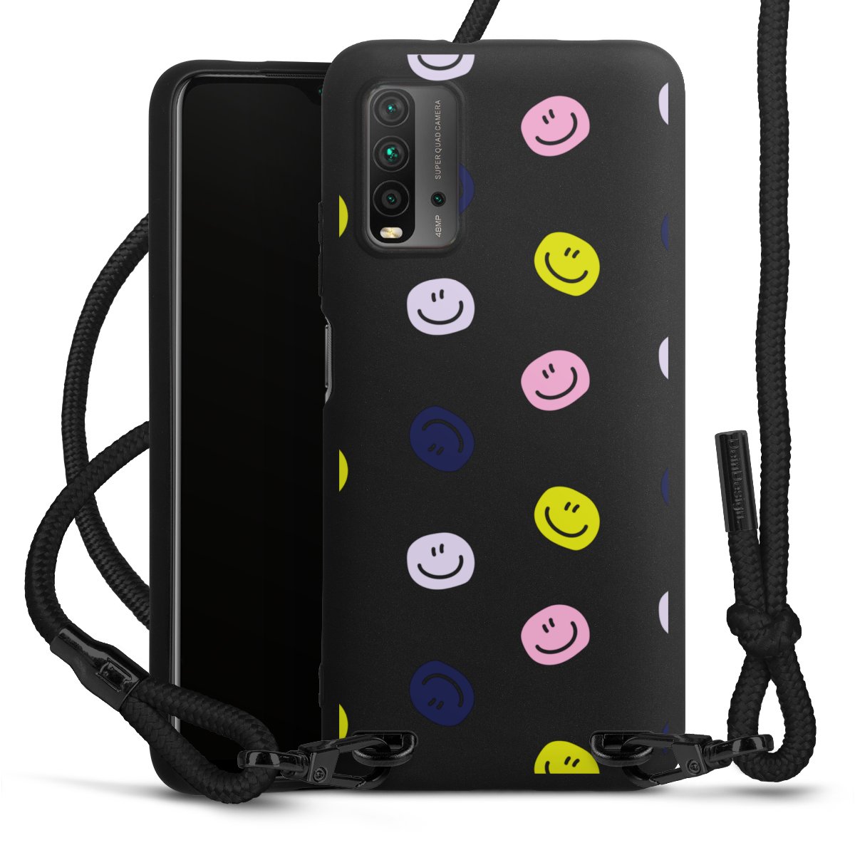 The matt black silicone case is made of flexible TPU (thermoplastic polyurethane) and offers robust protection. The durable, unbreakable material makes the cover flexible and dimensionally stable at the same time. The matte surface makes your design stand out more and is less susceptible to fingerprints and dirt. The stylish trend accessory fits comfortably in the hand and is perfectly complemented by the fabric (polyester) mobile phone strap. The braided fabric strap is approx. 1.70 metres long with a diameter of approx. 0.5 cm. Due to the special knotting technique, the length of the strap can be adjusted by simply pulling it, so that you can adapt it individually to your wishes. The practical case to wear around your neck is available with the fabric strap in black. As a little icing on the cake, we have provided the strap with a chic metal fastener in matt black. The strap is securely fastened to the case with loops made of high-quality genuine leather and press studs. The ends of the fabric strap are covered with metallic end caps and thus protected from fraying.