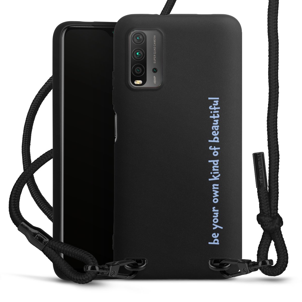 The matt black silicone case is made of flexible TPU (thermoplastic polyurethane) and offers robust protection. The durable, unbreakable material makes the cover flexible and dimensionally stable at the same time. The matte surface makes your design stand out more and is less susceptible to fingerprints and dirt. The stylish trend accessory fits comfortably in the hand and is perfectly complemented by the fabric (polyester) mobile phone strap. The braided fabric strap is approx. 1.70 metres long with a diameter of approx. 0.5 cm. Due to the special knotting technique, the length of the strap can be adjusted by simply pulling it, so that you can adapt it individually to your wishes. The practical case to wear around your neck is available with the fabric strap in black. As a little icing on the cake, we have provided the strap with a chic metal fastener in matt black. The strap is securely fastened to the case with loops made of high-quality genuine leather and press studs. The ends of the fabric strap are covered with metallic end caps and thus protected from fraying.