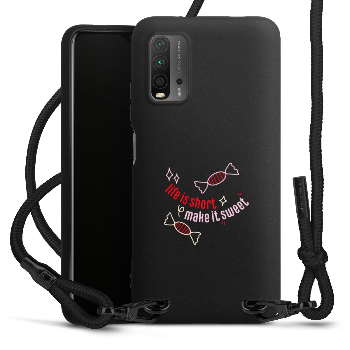 The matt black silicone case is made of flexible TPU (thermoplastic polyurethane) and offers robust protection. The durable, unbreakable material makes the cover flexible and dimensionally stable at the same time. The matte surface makes your design stand out more and is less susceptible to fingerprints and dirt. The stylish trend accessory fits comfortably in the hand and is perfectly complemented by the fabric (polyester) mobile phone strap. The braided fabric strap is approx. 1.70 metres long with a diameter of approx. 0.5 cm. Due to the special knotting technique, the length of the strap can be adjusted by simply pulling it, so that you can adapt it individually to your wishes. The practical case to wear around your neck is available with the fabric strap in black. As a little icing on the cake, we have provided the strap with a chic metal fastener in matt black. The strap is securely fastened to the case with loops made of high-quality genuine leather and press studs. The ends of the fabric strap are covered with metallic end caps and thus protected from fraying.