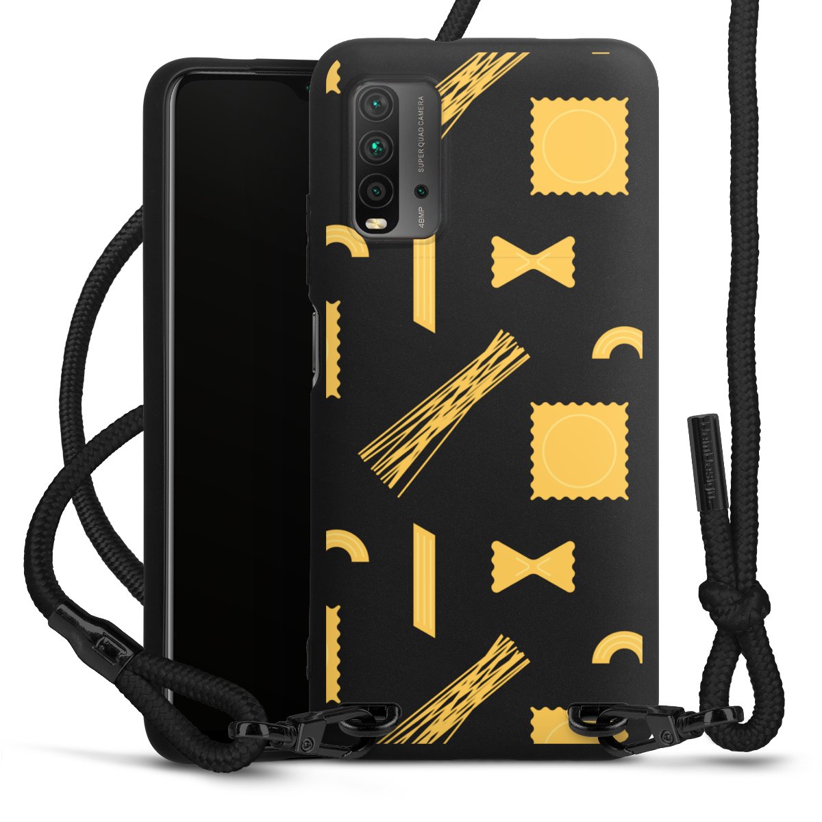 The matt black silicone case is made of flexible TPU (thermoplastic polyurethane) and offers robust protection. The durable, unbreakable material makes the cover flexible and dimensionally stable at the same time. The matte surface makes your design stand out more and is less susceptible to fingerprints and dirt. The stylish trend accessory fits comfortably in the hand and is perfectly complemented by the fabric (polyester) mobile phone strap. The braided fabric strap is approx. 1.70 metres long with a diameter of approx. 0.5 cm. Due to the special knotting technique, the length of the strap can be adjusted by simply pulling it, so that you can adapt it individually to your wishes. The practical case to wear around your neck is available with the fabric strap in black. As a little icing on the cake, we have provided the strap with a chic metal fastener in matt black. The strap is securely fastened to the case with loops made of high-quality genuine leather and press studs. The ends of the fabric strap are covered with metallic end caps and thus protected from fraying.