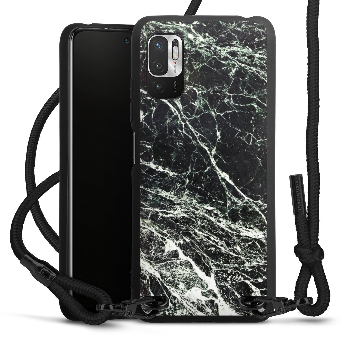 The matt black silicone case is made of flexible TPU (thermoplastic polyurethane) and offers robust protection. The durable, unbreakable material makes the cover flexible and dimensionally stable at the same time. The matte surface makes your design stand out more and is less susceptible to fingerprints and dirt. The stylish trend accessory fits comfortably in the hand and is perfectly complemented by the fabric (polyester) mobile phone strap. The braided fabric strap is approx. 1.70 metres long with a diameter of approx. 0.5 cm. Due to the special knotting technique, the length of the strap can be adjusted by simply pulling it, so that you can adapt it individually to your wishes. The practical case to wear around your neck is available with the fabric strap in black. As a little icing on the cake, we have provided the strap with a chic metal fastener in matt black. The strap is securely fastened to the case with loops made of high-quality genuine leather and press studs. The ends of the fabric strap are covered with metallic end caps and thus protected from fraying.