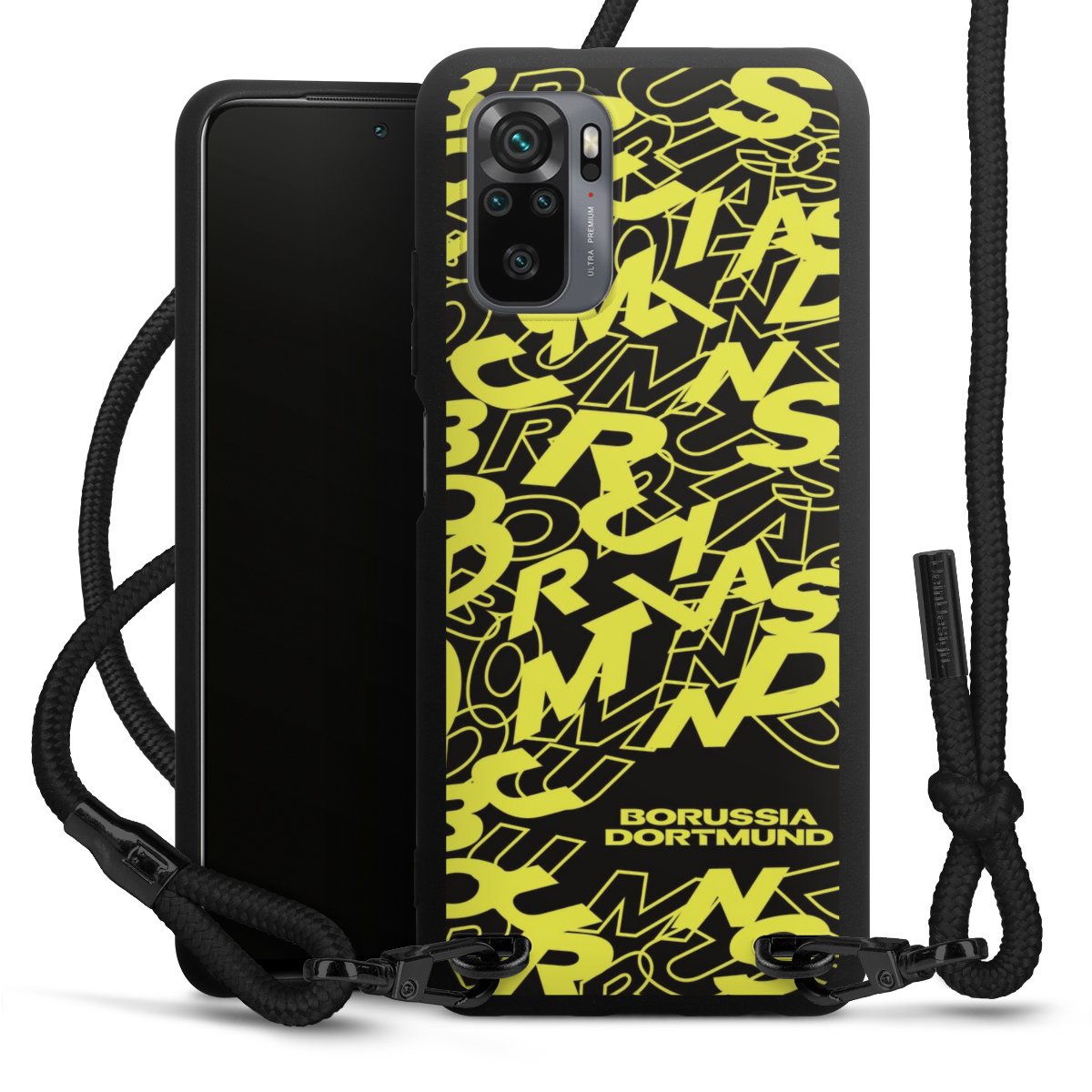 The matt black silicone case is made of flexible TPU (thermoplastic polyurethane) and offers robust protection. The durable, unbreakable material makes the cover flexible and dimensionally stable at the same time. The matte surface makes your design stand out more and is less susceptible to fingerprints and dirt. The stylish trend accessory fits comfortably in the hand and is perfectly complemented by the fabric (polyester) mobile phone strap. The braided fabric strap is approx. 1.70 metres long with a diameter of approx. 0.5 cm. Due to the special knotting technique, the length of the strap can be adjusted by simply pulling it, so that you can adapt it individually to your wishes. The practical case to wear around your neck is available with the fabric strap in black. As a little icing on the cake, we have provided the strap with a chic metal fastener in matt black. The strap is securely fastened to the case with loops made of high-quality genuine leather and press studs. The ends of the fabric strap are covered with metallic end caps and thus protected from fraying.