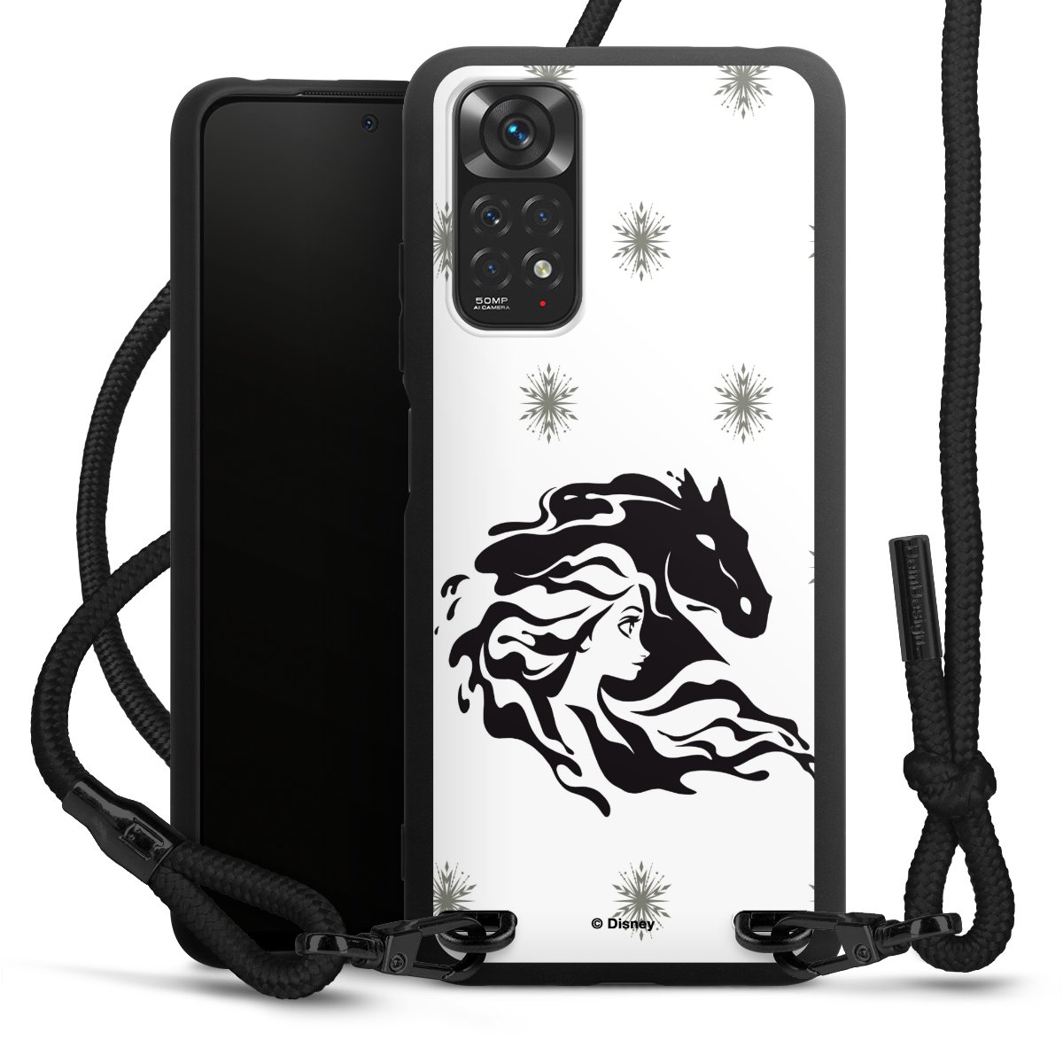 The matt black silicone case is made of flexible TPU (thermoplastic polyurethane) and offers robust protection. The durable, unbreakable material makes the cover flexible and dimensionally stable at the same time. The matte surface makes your design stand out more and is less susceptible to fingerprints and dirt. The stylish trend accessory fits comfortably in the hand and is perfectly complemented by the fabric (polyester) mobile phone strap. The braided fabric strap is approx. 1.70 metres long with a diameter of approx. 0.5 cm. Due to the special knotting technique, the length of the strap can be adjusted by simply pulling it, so that you can adapt it individually to your wishes. The practical case to wear around your neck is available with the fabric strap in black. As a little icing on the cake, we have provided the strap with a chic metal fastener in matt black. The strap is securely fastened to the case with loops made of high-quality genuine leather and press studs. The ends of the fabric strap are covered with metallic end caps and thus protected from fraying.