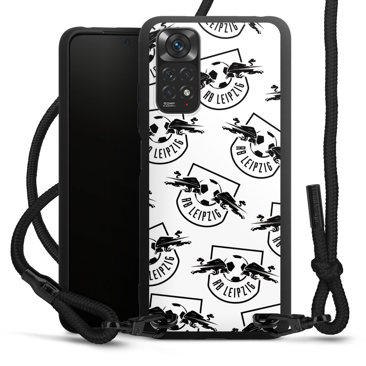 The matt black silicone case is made of flexible TPU (thermoplastic polyurethane) and offers robust protection. The durable, unbreakable material makes the cover flexible and dimensionally stable at the same time. The matte surface makes your design stand out more and is less susceptible to fingerprints and dirt. The stylish trend accessory fits comfortably in the hand and is perfectly complemented by the fabric (polyester) mobile phone strap. The braided fabric strap is approx. 1.70 metres long with a diameter of approx. 0.5 cm. Due to the special knotting technique, the length of the strap can be adjusted by simply pulling it, so that you can adapt it individually to your wishes. The practical case to wear around your neck is available with the fabric strap in black. As a little icing on the cake, we have provided the strap with a chic metal fastener in matt black. The strap is securely fastened to the case with loops made of high-quality genuine leather and press studs. The ends of the fabric strap are covered with metallic end caps and thus protected from fraying.