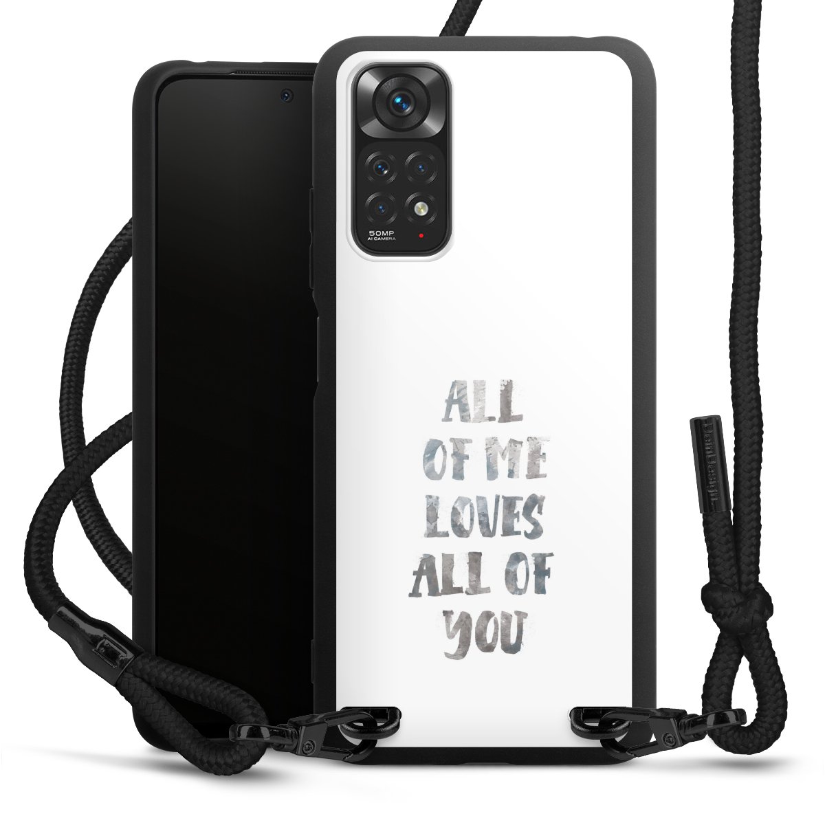 The matt black silicone case is made of flexible TPU (thermoplastic polyurethane) and offers robust protection. The durable, unbreakable material makes the cover flexible and dimensionally stable at the same time. The matte surface makes your design stand out more and is less susceptible to fingerprints and dirt. The stylish trend accessory fits comfortably in the hand and is perfectly complemented by the fabric (polyester) mobile phone strap. The braided fabric strap is approx. 1.70 metres long with a diameter of approx. 0.5 cm. Due to the special knotting technique, the length of the strap can be adjusted by simply pulling it, so that you can adapt it individually to your wishes. The practical case to wear around your neck is available with the fabric strap in black. As a little icing on the cake, we have provided the strap with a chic metal fastener in matt black. The strap is securely fastened to the case with loops made of high-quality genuine leather and press studs. The ends of the fabric strap are covered with metallic end caps and thus protected from fraying.