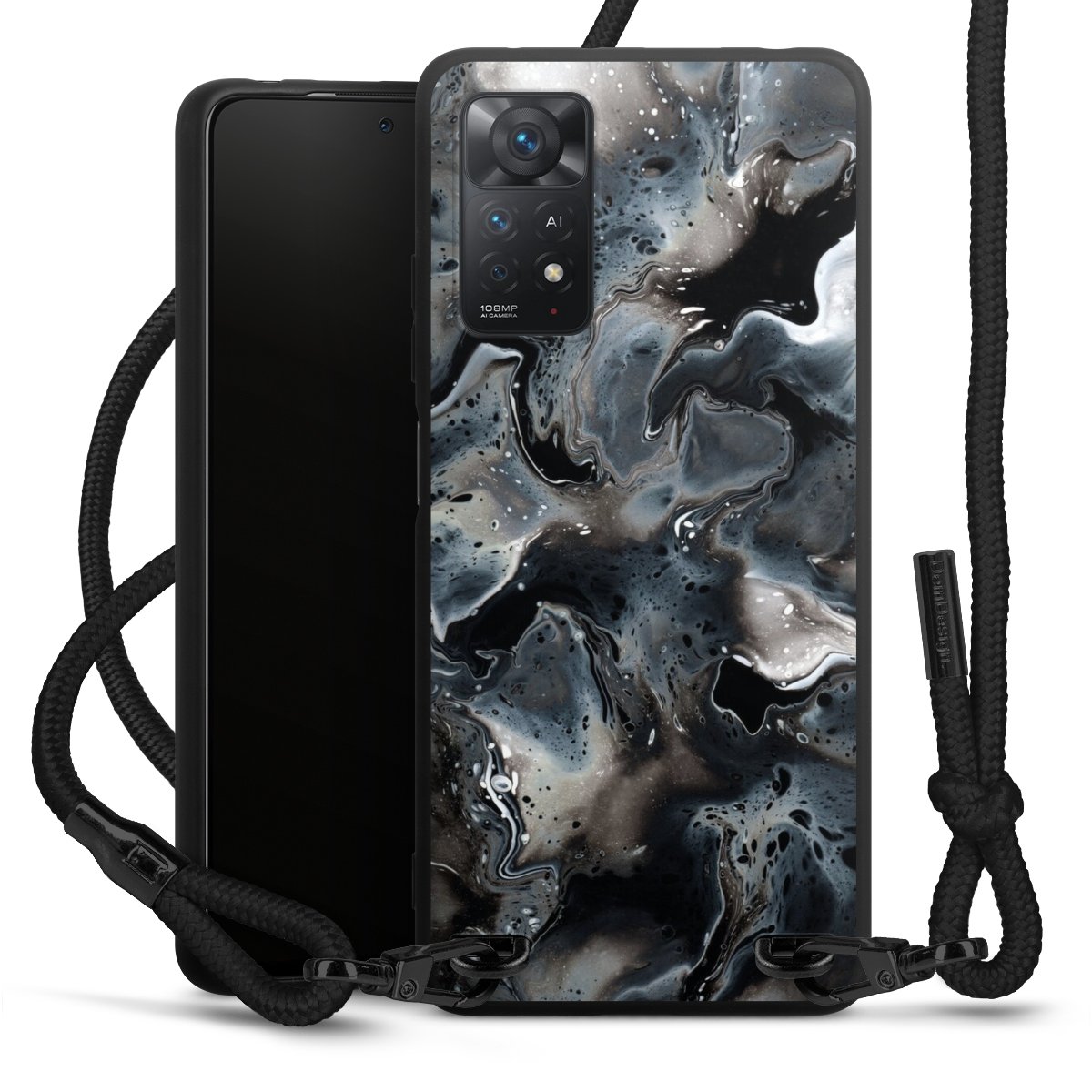 The matt black silicone case is made of flexible TPU (thermoplastic polyurethane) and offers robust protection. The durable, unbreakable material makes the cover flexible and dimensionally stable at the same time. The matte surface makes your design stand out more and is less susceptible to fingerprints and dirt. The stylish trend accessory fits comfortably in the hand and is perfectly complemented by the fabric (polyester) mobile phone strap. The braided fabric strap is approx. 1.70 metres long with a diameter of approx. 0.5 cm. Due to the special knotting technique, the length of the strap can be adjusted by simply pulling it, so that you can adapt it individually to your wishes. The practical case to wear around your neck is available with the fabric strap in black. As a little icing on the cake, we have provided the strap with a chic metal fastener in matt black. The strap is securely fastened to the case with loops made of high-quality genuine leather and press studs. The ends of the fabric strap are covered with metallic end caps and thus protected from fraying.