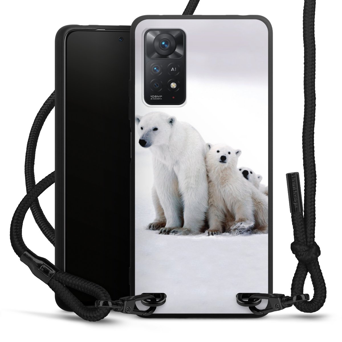 The matt black silicone case is made of flexible TPU (thermoplastic polyurethane) and offers robust protection. The durable, unbreakable material makes the cover flexible and dimensionally stable at the same time. The matte surface makes your design stand out more and is less susceptible to fingerprints and dirt. The stylish trend accessory fits comfortably in the hand and is perfectly complemented by the fabric (polyester) mobile phone strap. The braided fabric strap is approx. 1.70 metres long with a diameter of approx. 0.5 cm. Due to the special knotting technique, the length of the strap can be adjusted by simply pulling it, so that you can adapt it individually to your wishes. The practical case to wear around your neck is available with the fabric strap in black. As a little icing on the cake, we have provided the strap with a chic metal fastener in matt black. The strap is securely fastened to the case with loops made of high-quality genuine leather and press studs. The ends of the fabric strap are covered with metallic end caps and thus protected from fraying.