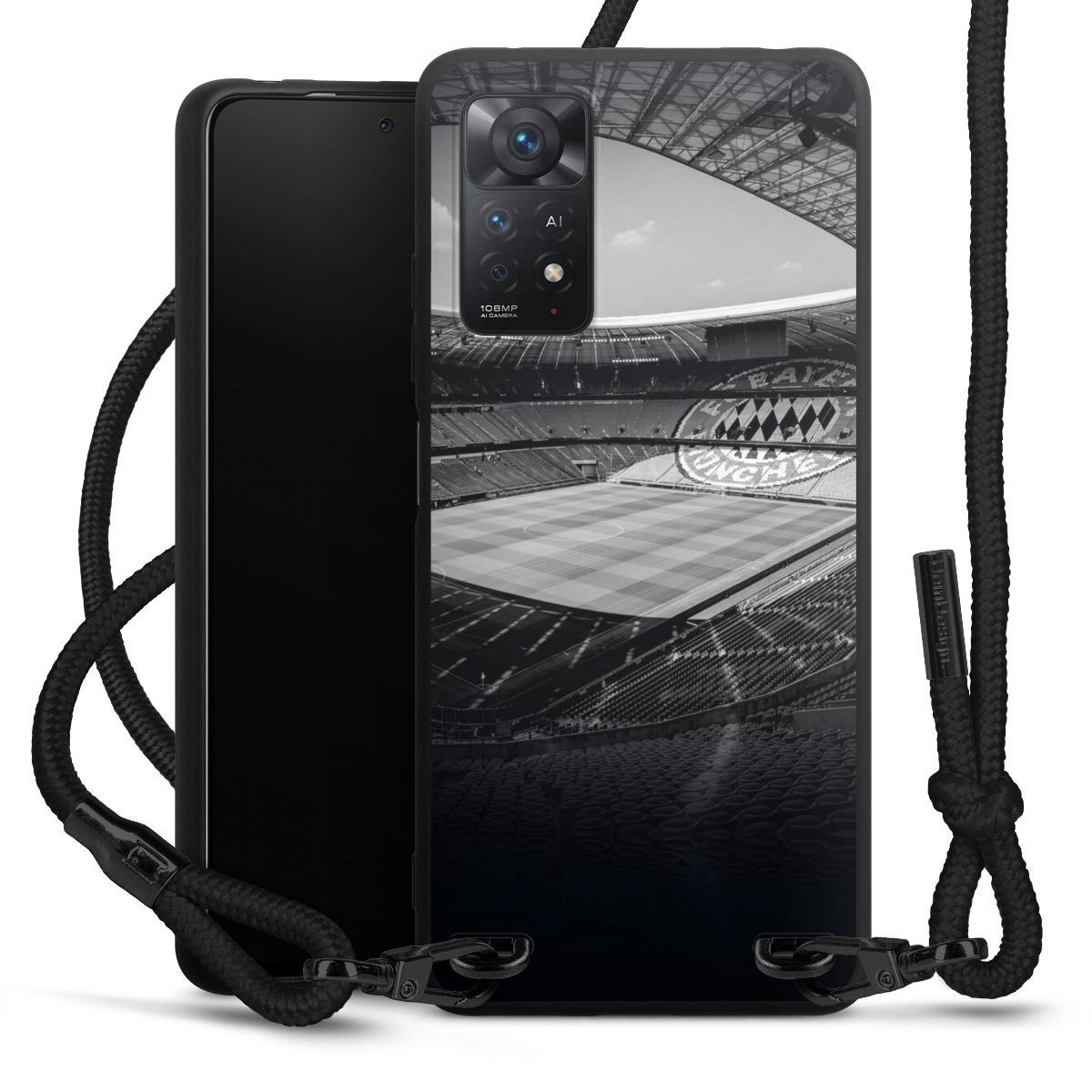 The matt black silicone case is made of flexible TPU (thermoplastic polyurethane) and offers robust protection. The durable, unbreakable material makes the cover flexible and dimensionally stable at the same time. The matte surface makes your design stand out more and is less susceptible to fingerprints and dirt. The stylish trend accessory fits comfortably in the hand and is perfectly complemented by the fabric (polyester) mobile phone strap. The braided fabric strap is approx. 1.70 metres long with a diameter of approx. 0.5 cm. Due to the special knotting technique, the length of the strap can be adjusted by simply pulling it, so that you can adapt it individually to your wishes. The practical case to wear around your neck is available with the fabric strap in black. As a little icing on the cake, we have provided the strap with a chic metal fastener in matt black. The strap is securely fastened to the case with loops made of high-quality genuine leather and press studs. The ends of the fabric strap are covered with metallic end caps and thus protected from fraying.