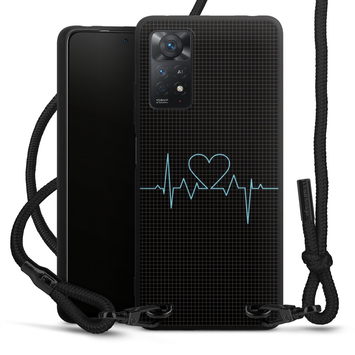 The matt black silicone case is made of flexible TPU (thermoplastic polyurethane) and offers robust protection. The durable, unbreakable material makes the cover flexible and dimensionally stable at the same time. The matte surface makes your design stand out more and is less susceptible to fingerprints and dirt. The stylish trend accessory fits comfortably in the hand and is perfectly complemented by the fabric (polyester) mobile phone strap. The braided fabric strap is approx. 1.70 metres long with a diameter of approx. 0.5 cm. Due to the special knotting technique, the length of the strap can be adjusted by simply pulling it, so that you can adapt it individually to your wishes. The practical case to wear around your neck is available with the fabric strap in black. As a little icing on the cake, we have provided the strap with a chic metal fastener in matt black. The strap is securely fastened to the case with loops made of high-quality genuine leather and press studs. The ends of the fabric strap are covered with metallic end caps and thus protected from fraying.