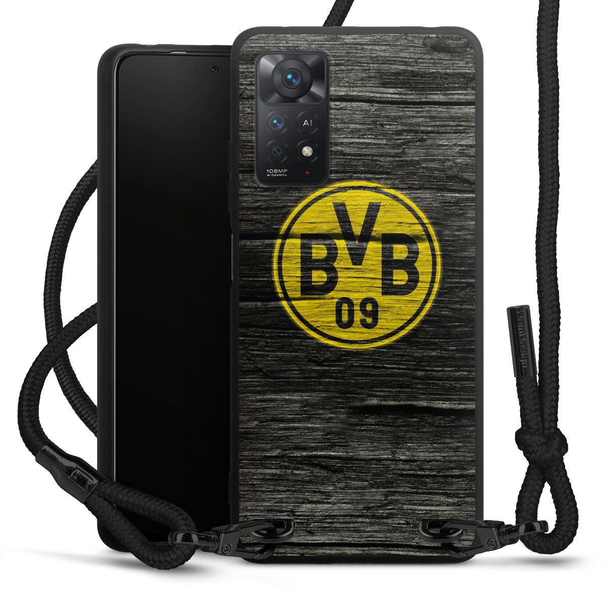 The matt black silicone case is made of flexible TPU (thermoplastic polyurethane) and offers robust protection. The durable, unbreakable material makes the cover flexible and dimensionally stable at the same time. The matte surface makes your design stand out more and is less susceptible to fingerprints and dirt. The stylish trend accessory fits comfortably in the hand and is perfectly complemented by the fabric (polyester) mobile phone strap. The braided fabric strap is approx. 1.70 metres long with a diameter of approx. 0.5 cm. Due to the special knotting technique, the length of the strap can be adjusted by simply pulling it, so that you can adapt it individually to your wishes. The practical case to wear around your neck is available with the fabric strap in black. As a little icing on the cake, we have provided the strap with a chic metal fastener in matt black. The strap is securely fastened to the case with loops made of high-quality genuine leather and press studs. The ends of the fabric strap are covered with metallic end caps and thus protected from fraying.